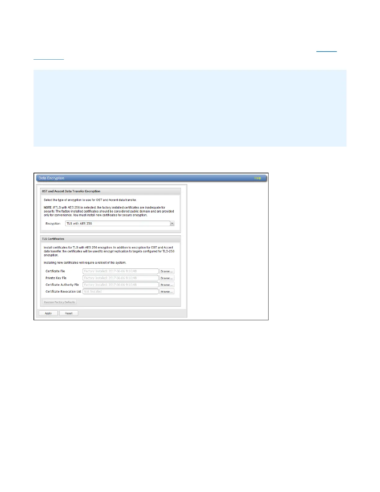 l The DXi uses the TLS with AES 256 certificate authority as the arbiter of trust. To ensure the security