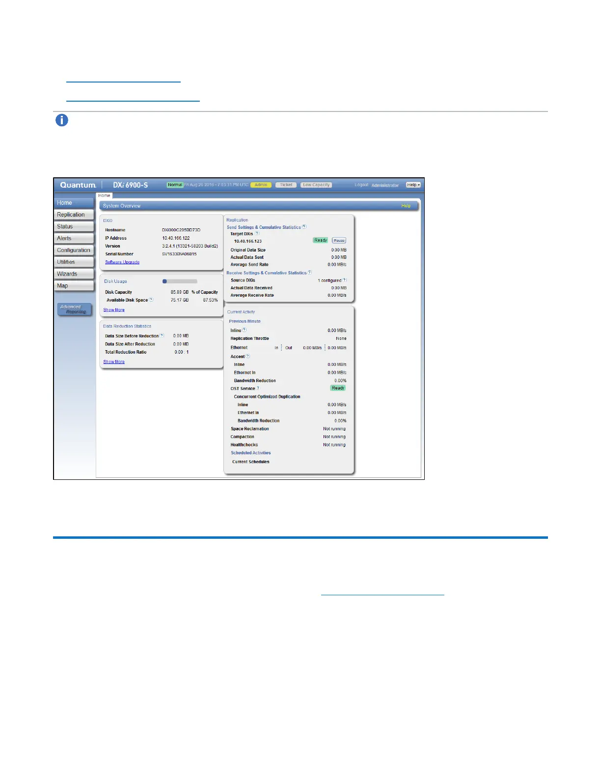 The DXi6900SystemOverview on the Home page (see Figure 79 on the next page) displays the following