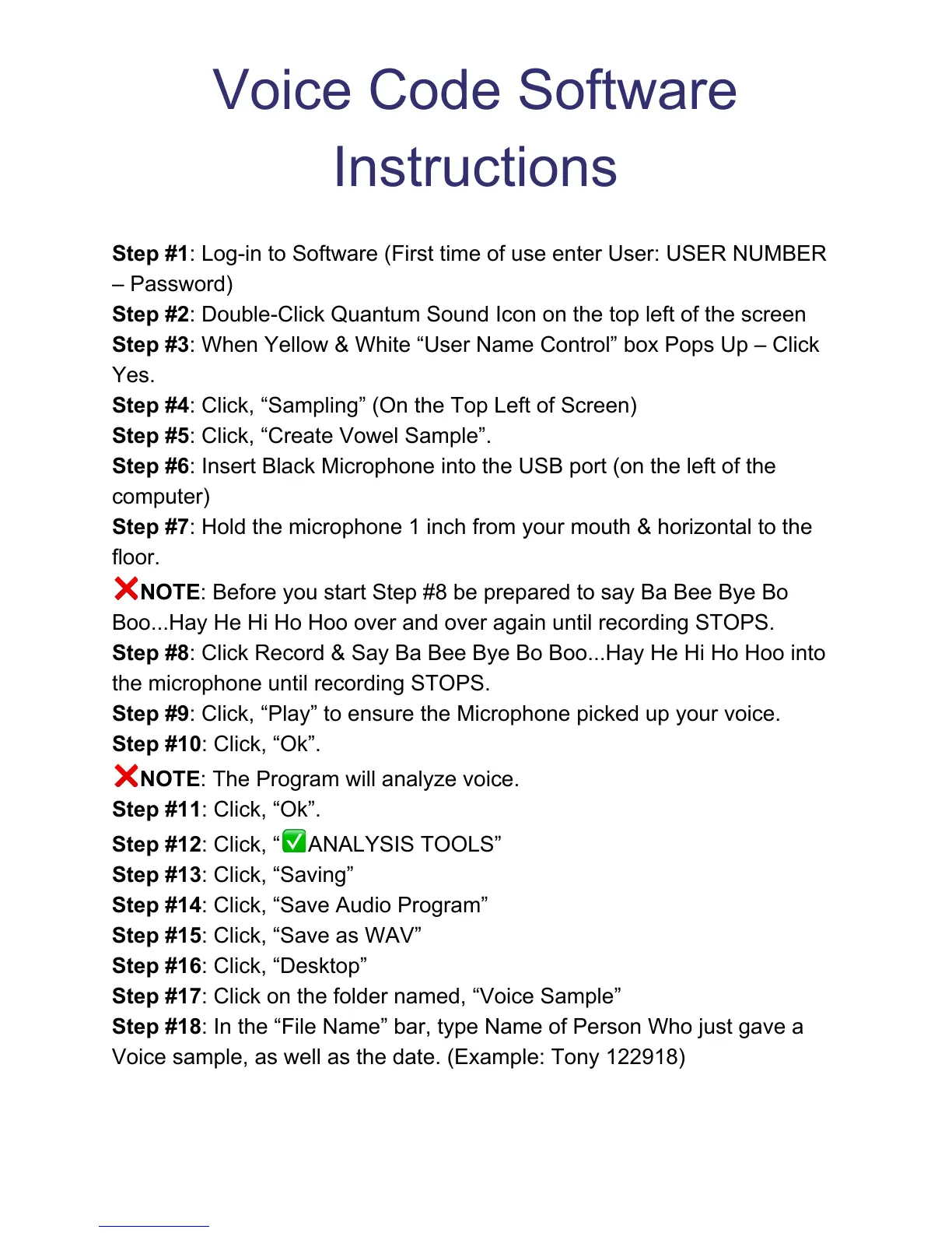 Voice sample, as well as the date. (Example: Tony 122918)