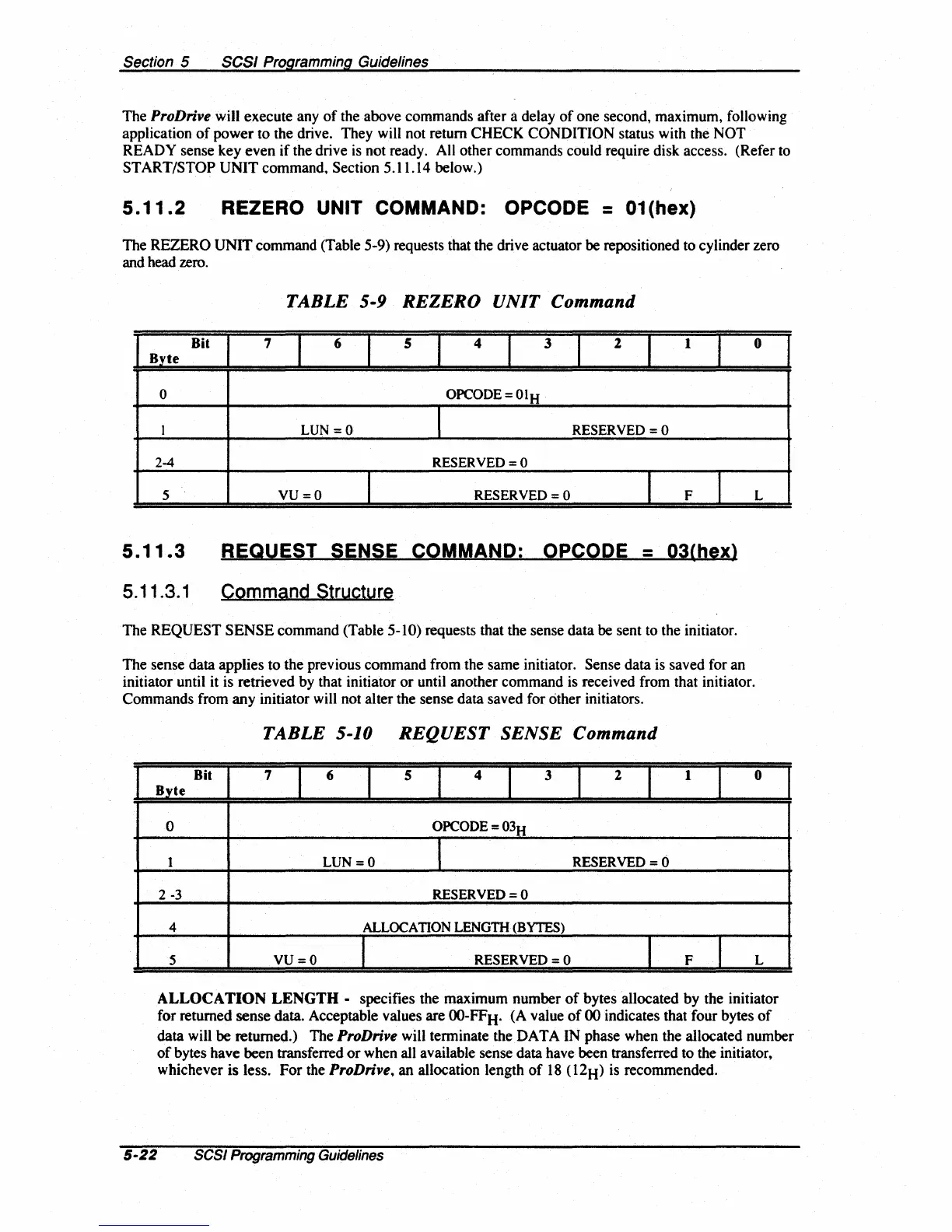 The REZERO UNIT command (Table 5-9) requests that the drive actuator be repositioned to cylinder zero