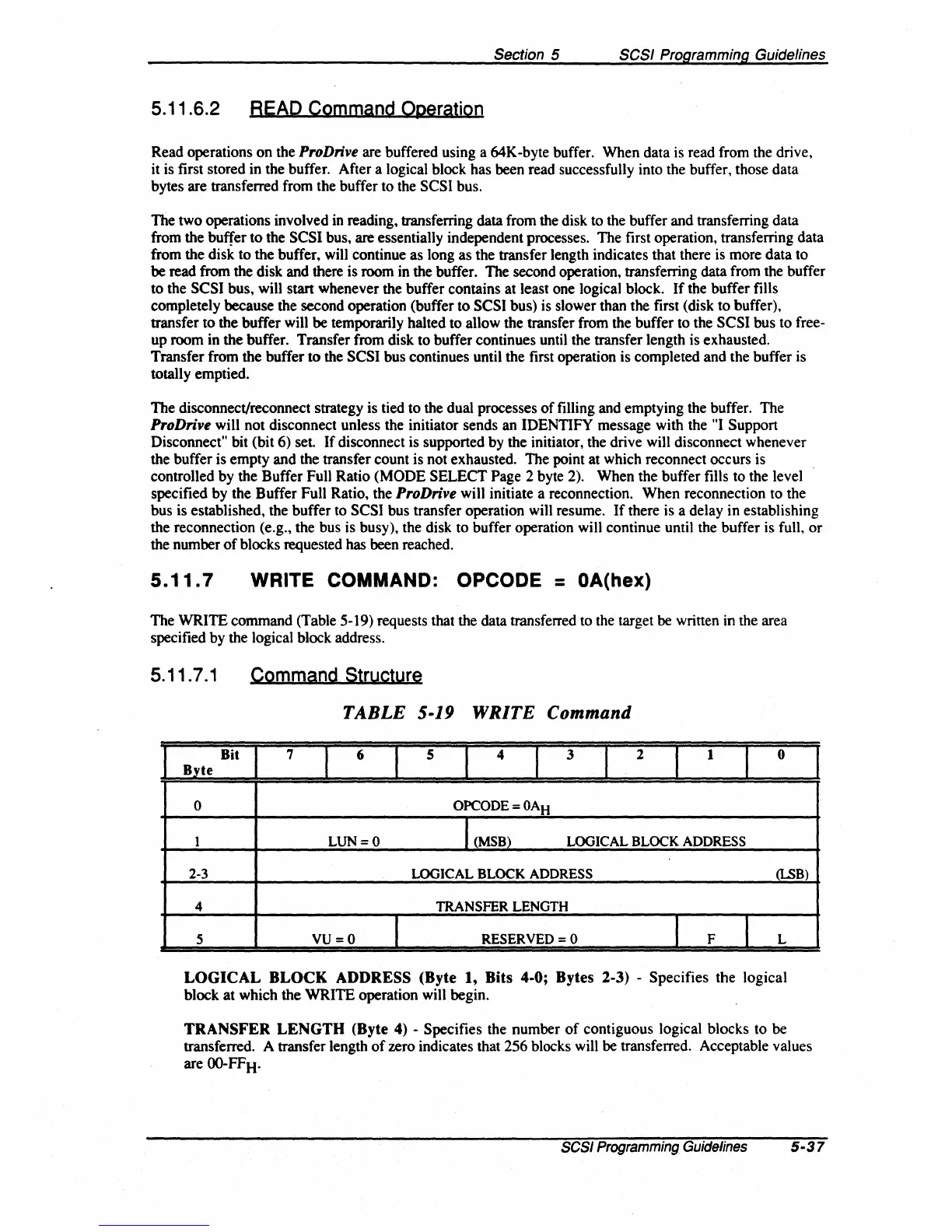 The WRITE command (Table 5-19) requests that the data transferred to the target be written in the area