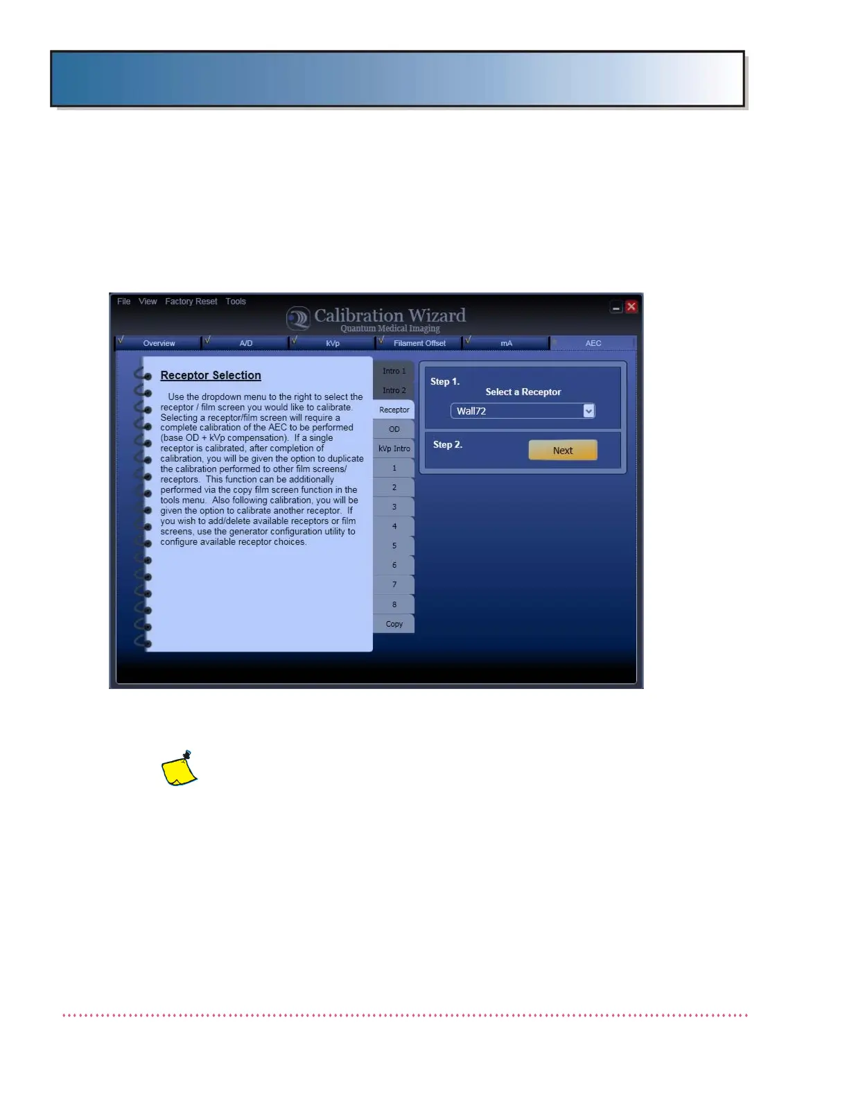 ing tab (choices are Receptor, OD, kVp Intro and kVp calibration steps 1