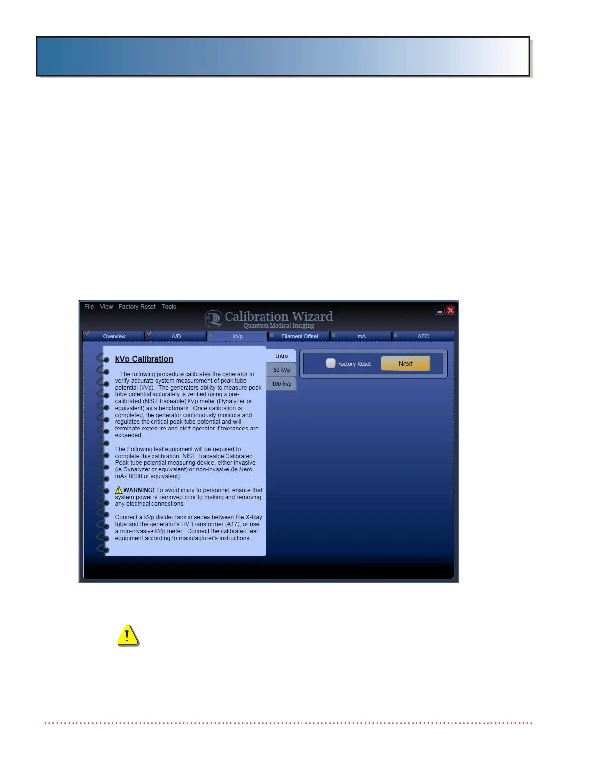 1. If not already done so, access the Calibration Wizard - kVp Calibration tab