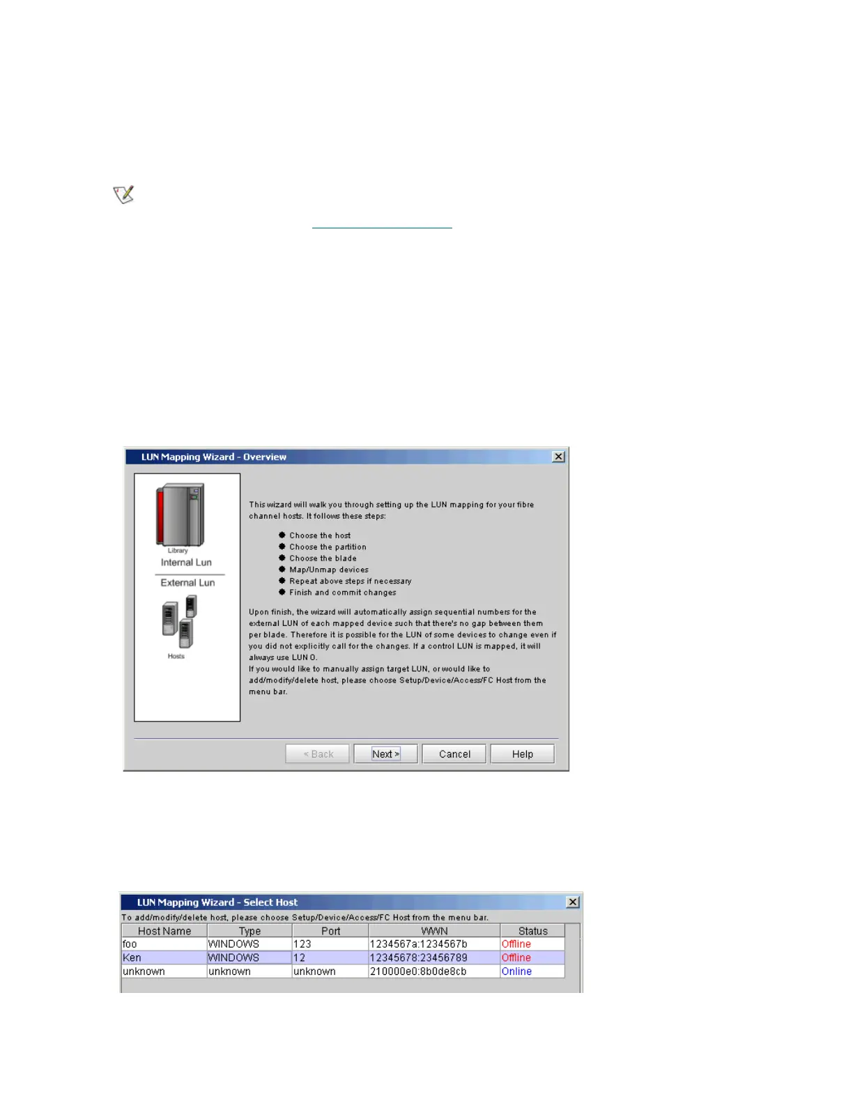 The LUN Mapping Wizard guides you through the setup of LUN mapping for your Fibre Channel hosts.