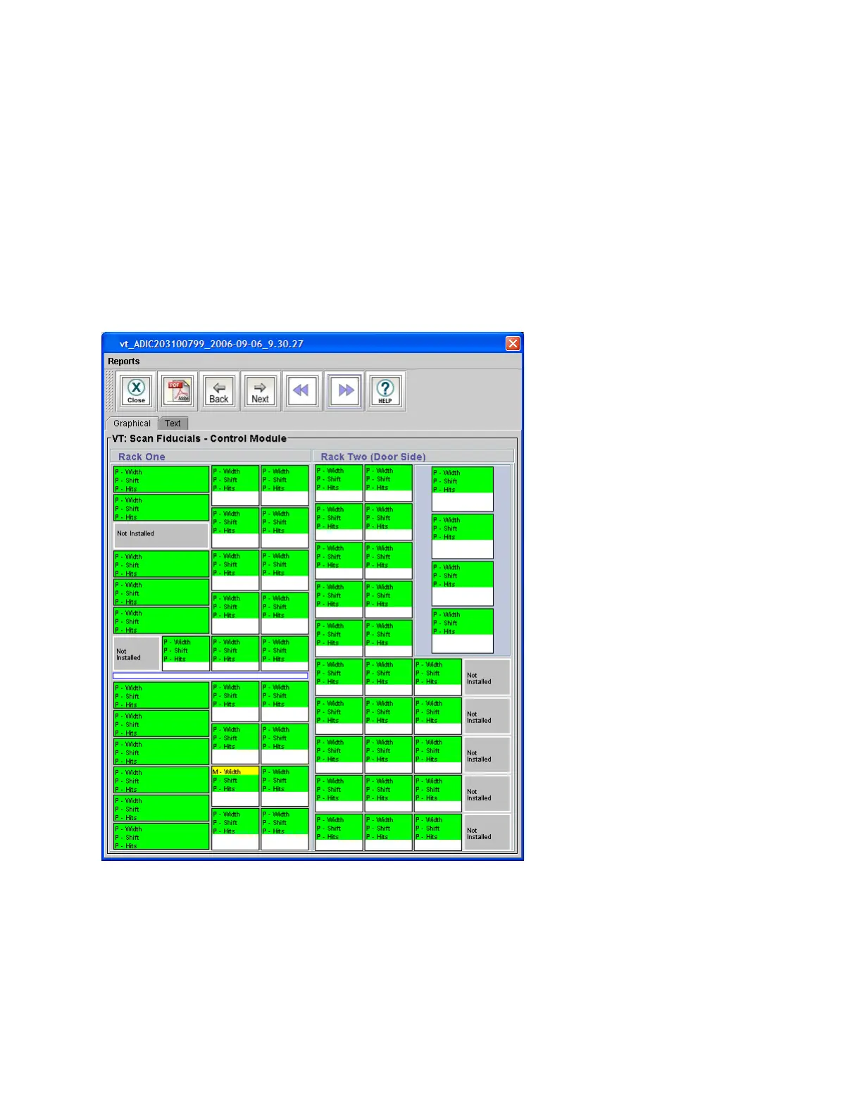 The scan fiducials graphical report shows the results for tests of the fiducial barcode on each tape magazine