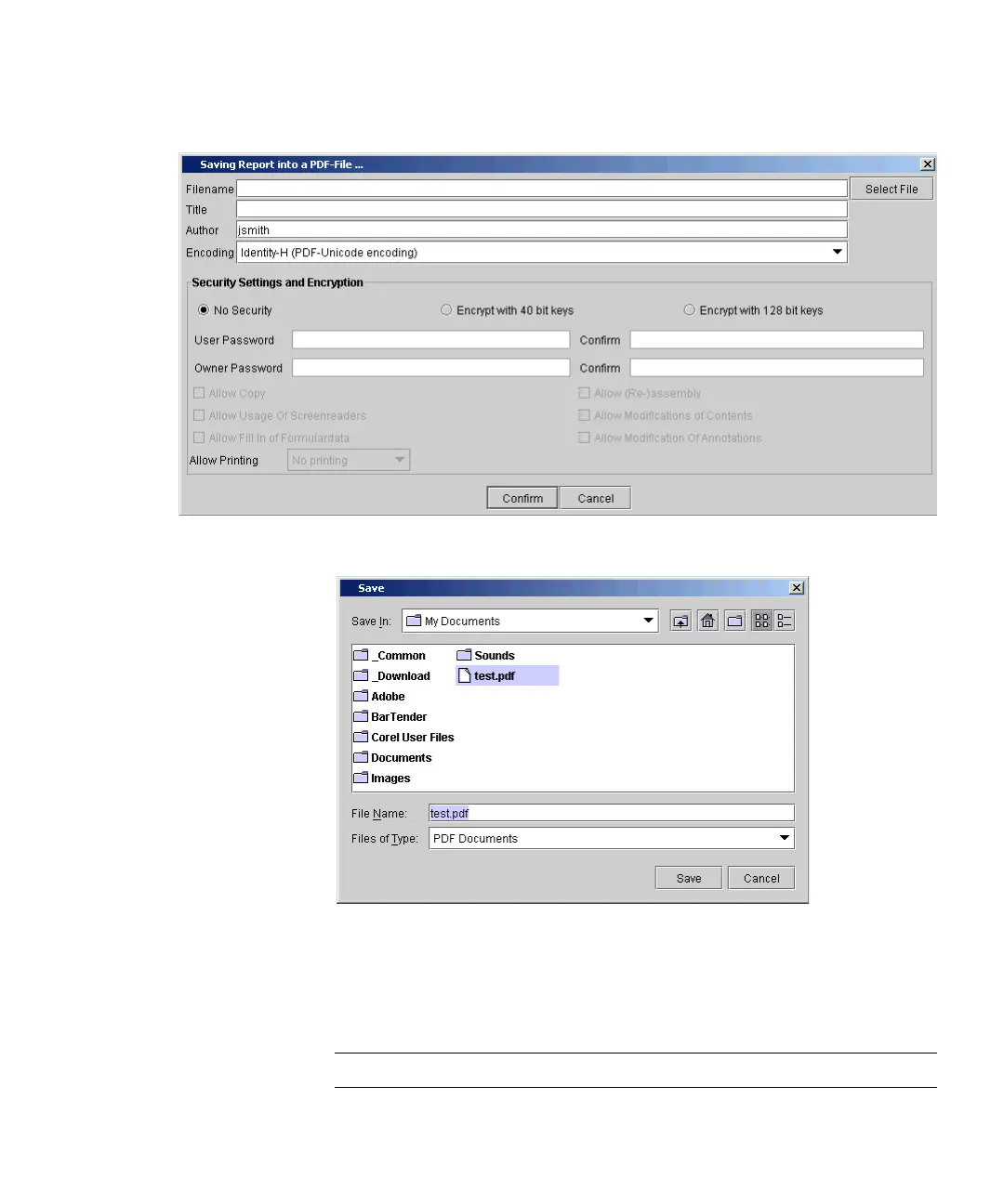 4 In the Saving Report into a PDF-File dialog box, enter the settings