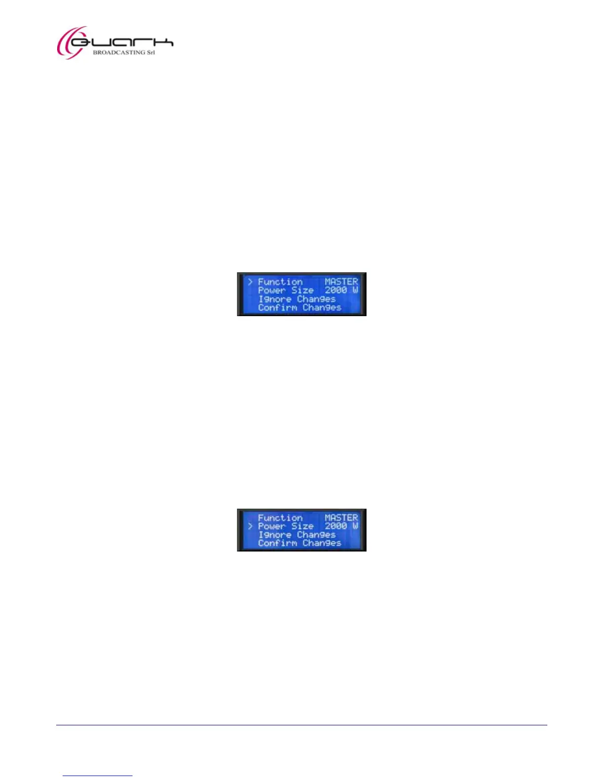 This menu allows to set the equipment as MASTER (standalone single equipment) or SLAVE (working within a broadcasting