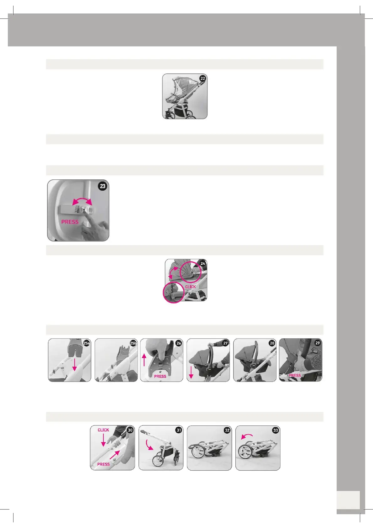 First of all assemble the car seat adapters such as the carrycot, see section 8. (25a-25b and 26). Then click