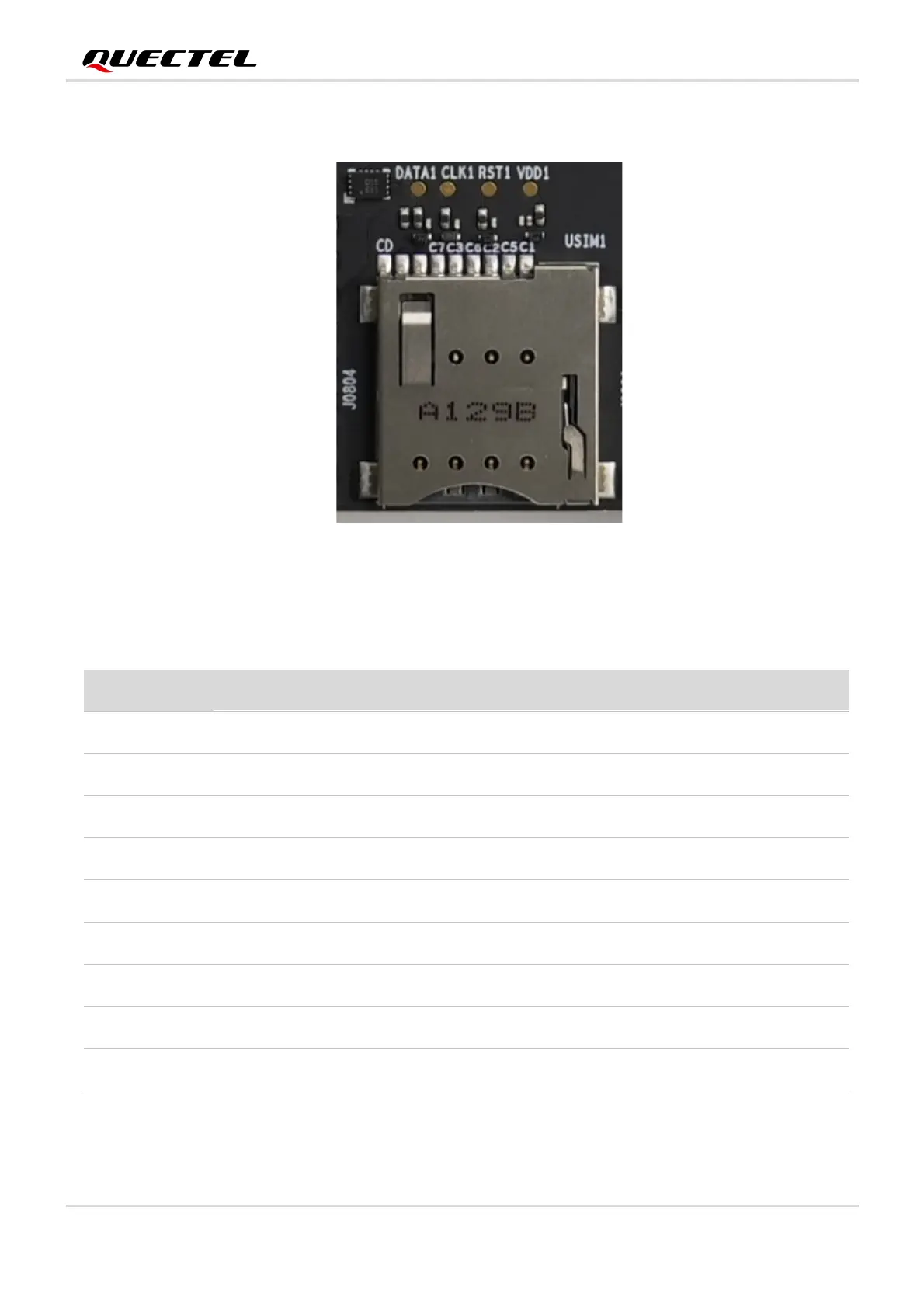 The figure and table below illustrate the pin assignment and definition of (U)SIM card connector J0804.