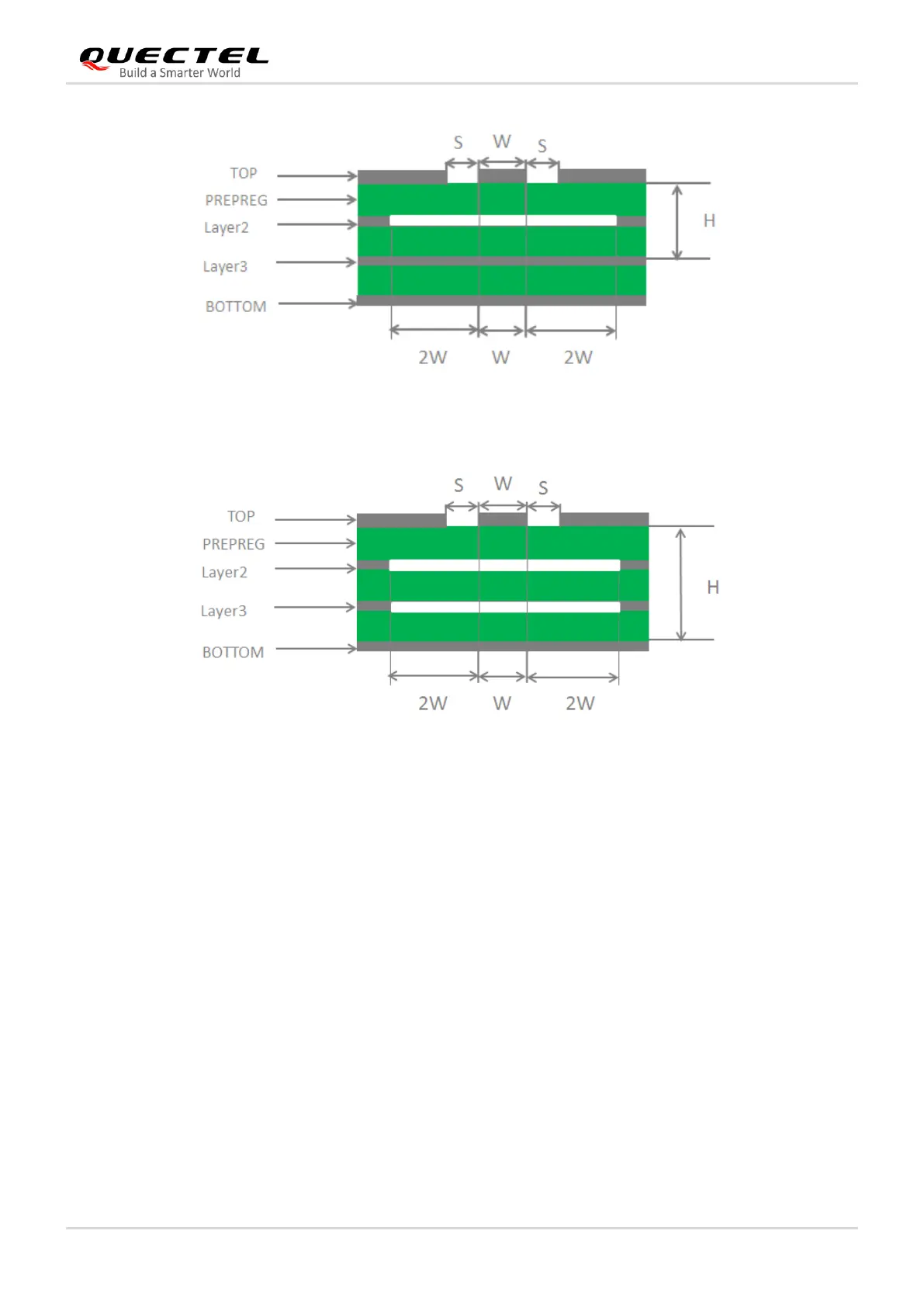 the ground vias and RF traces should be no less than two times the width of RF signal traces (2 × W).