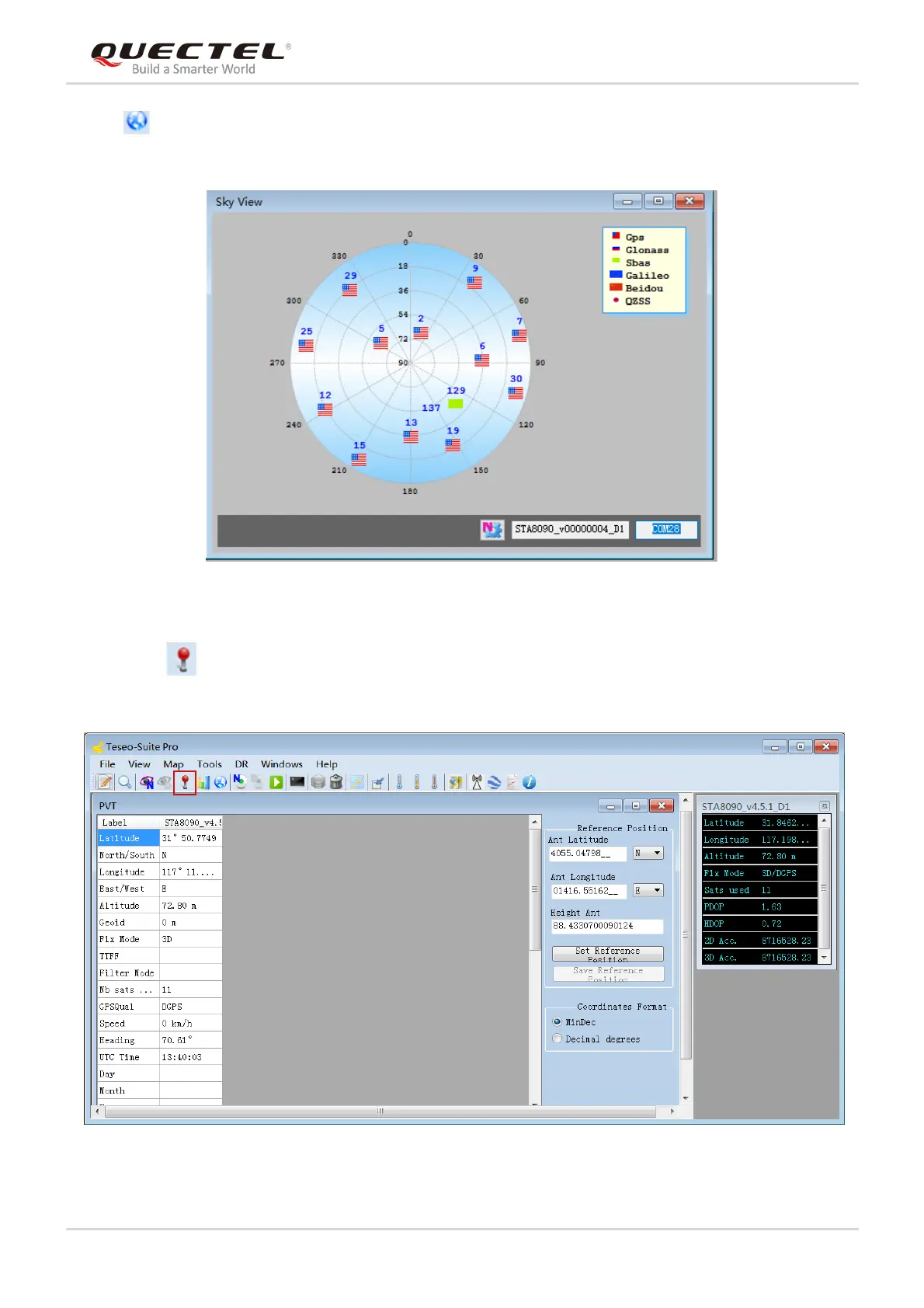 By clicking button, users can view the information such as positions, altitudes, fix modes, satellites in