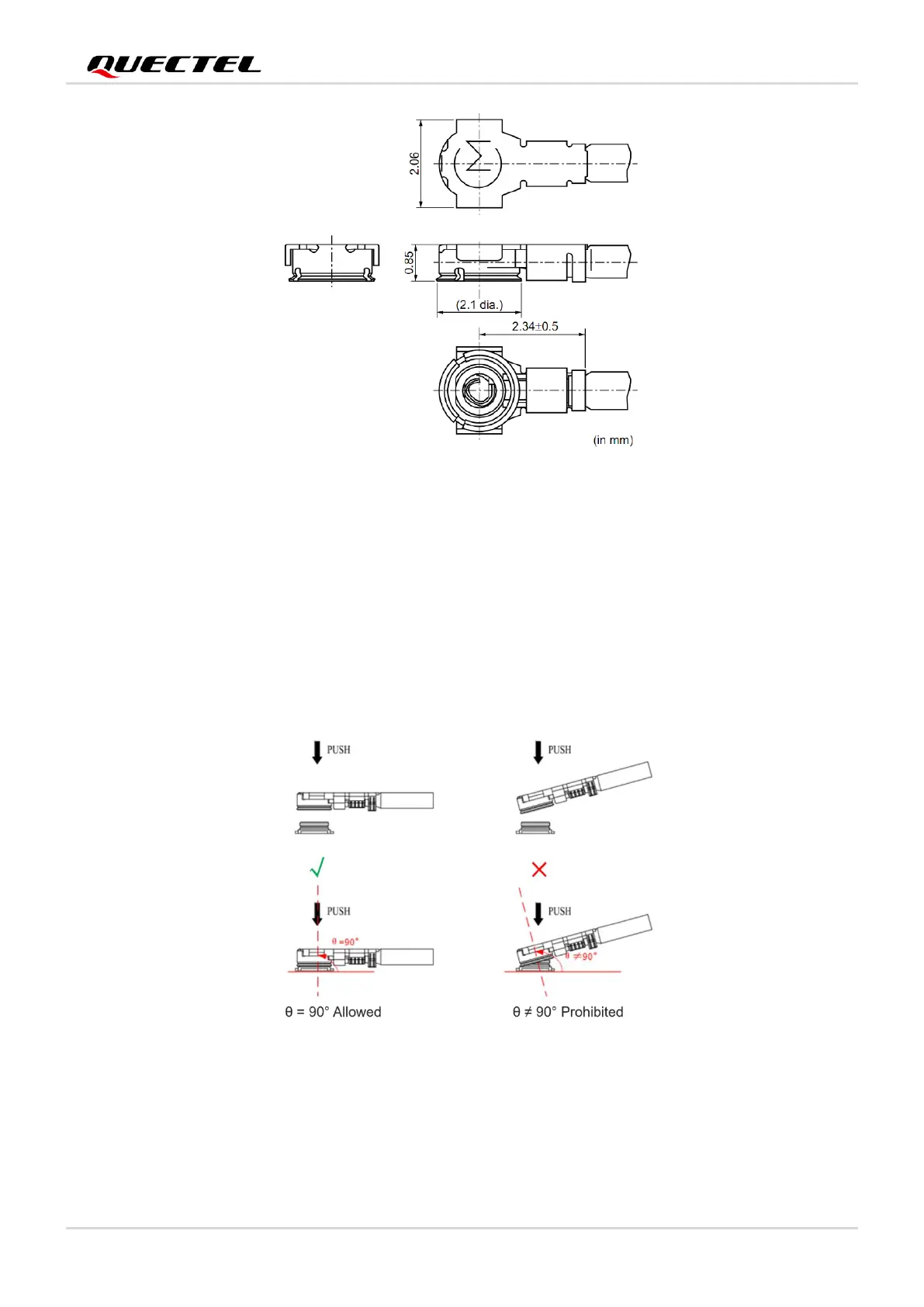 The illustration of pulling out the coaxial cable plug is shown below, θ = 90° is acceptable, while θ ≠ 90° is