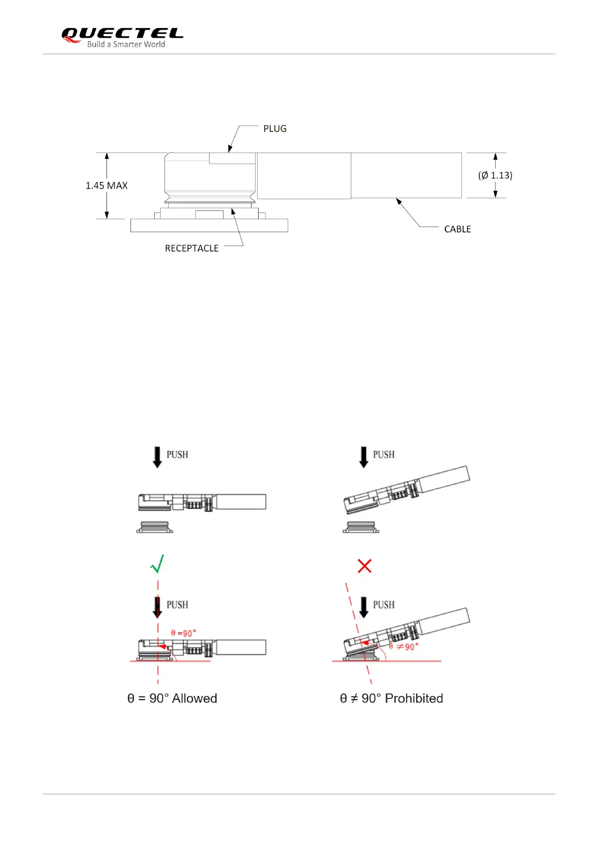 The illustration for plugging in a coaxial cable plug is shown below, θ = 90° is acceptable, while θ ≠ 90° is