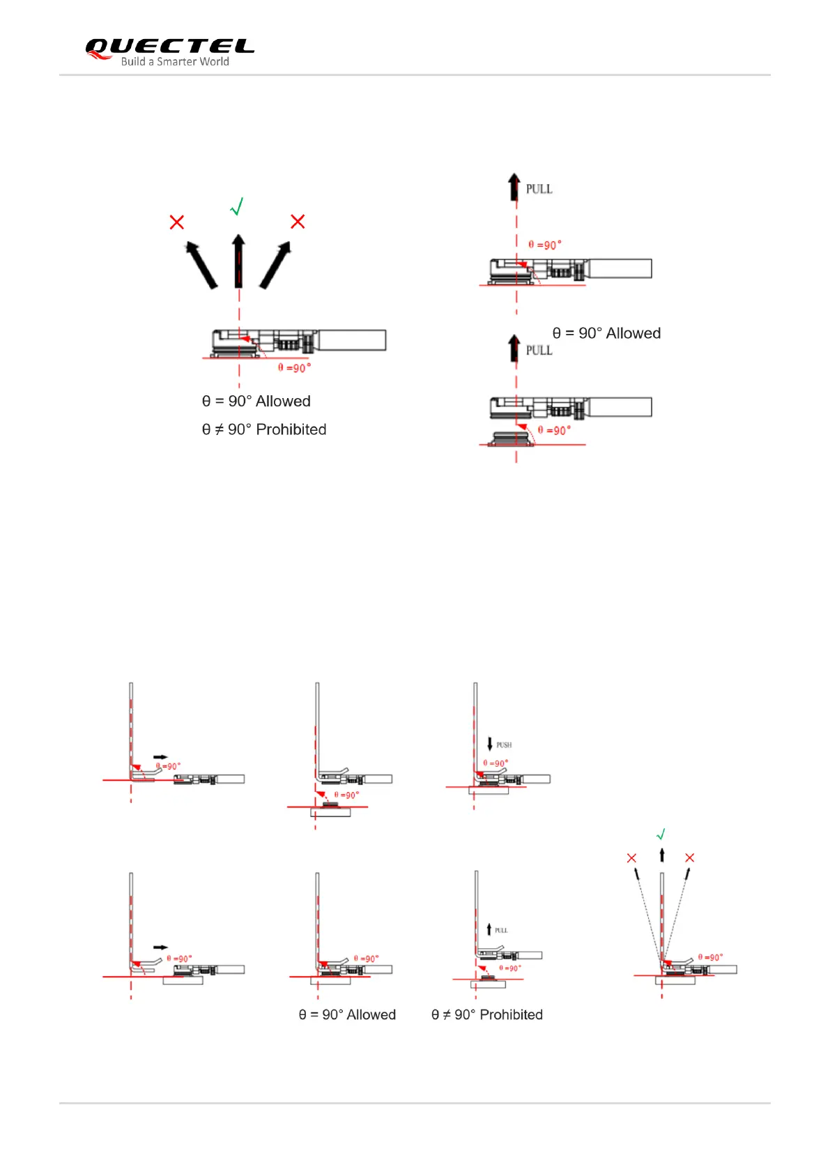 The illustration of pulling out the coaxial cable plug is shown below, θ = 90° is acceptable, while θ ≠ 90° is