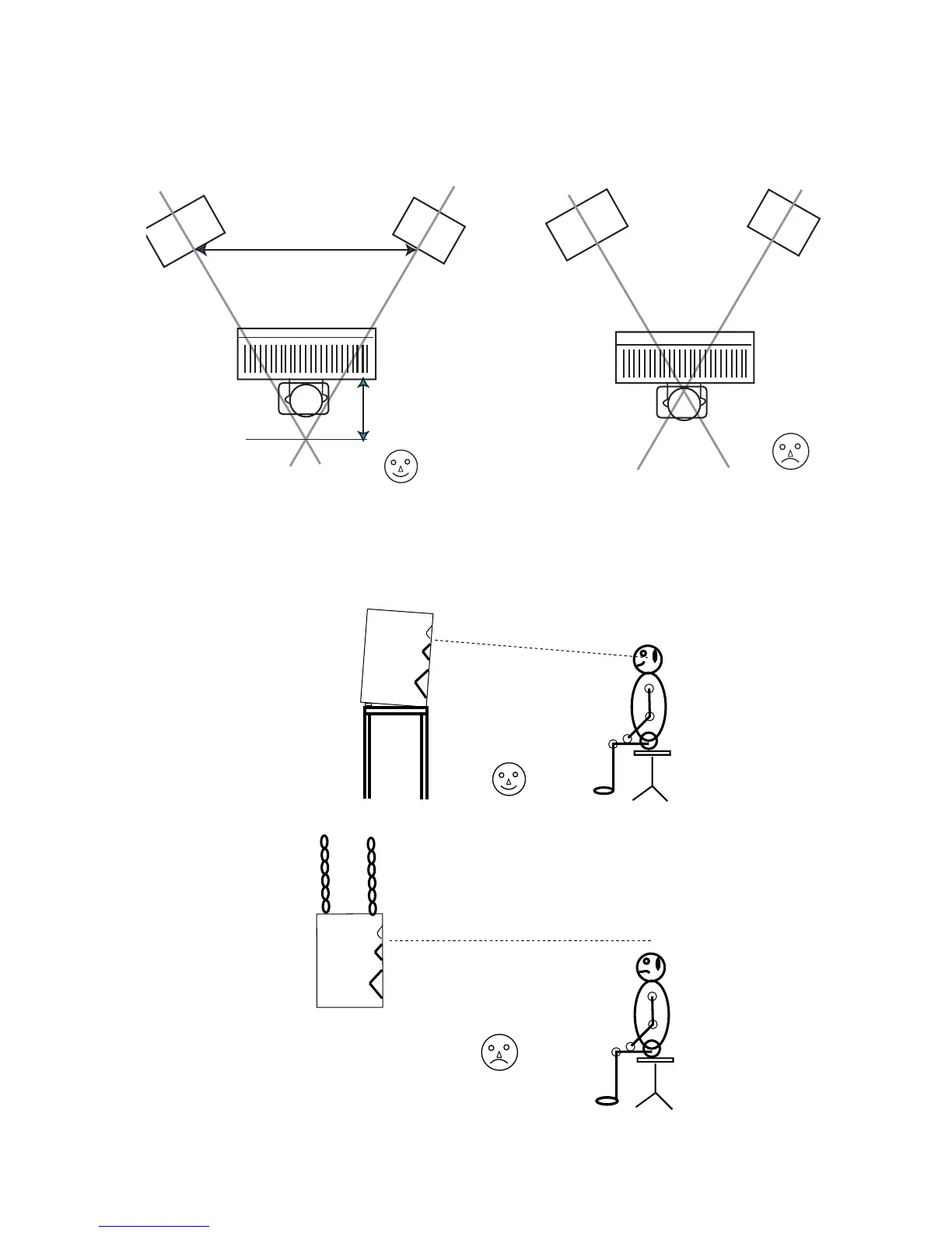 Sketch showing positioning of speakers. The speakers should be between 1.9 to 2.8 meters apart and the