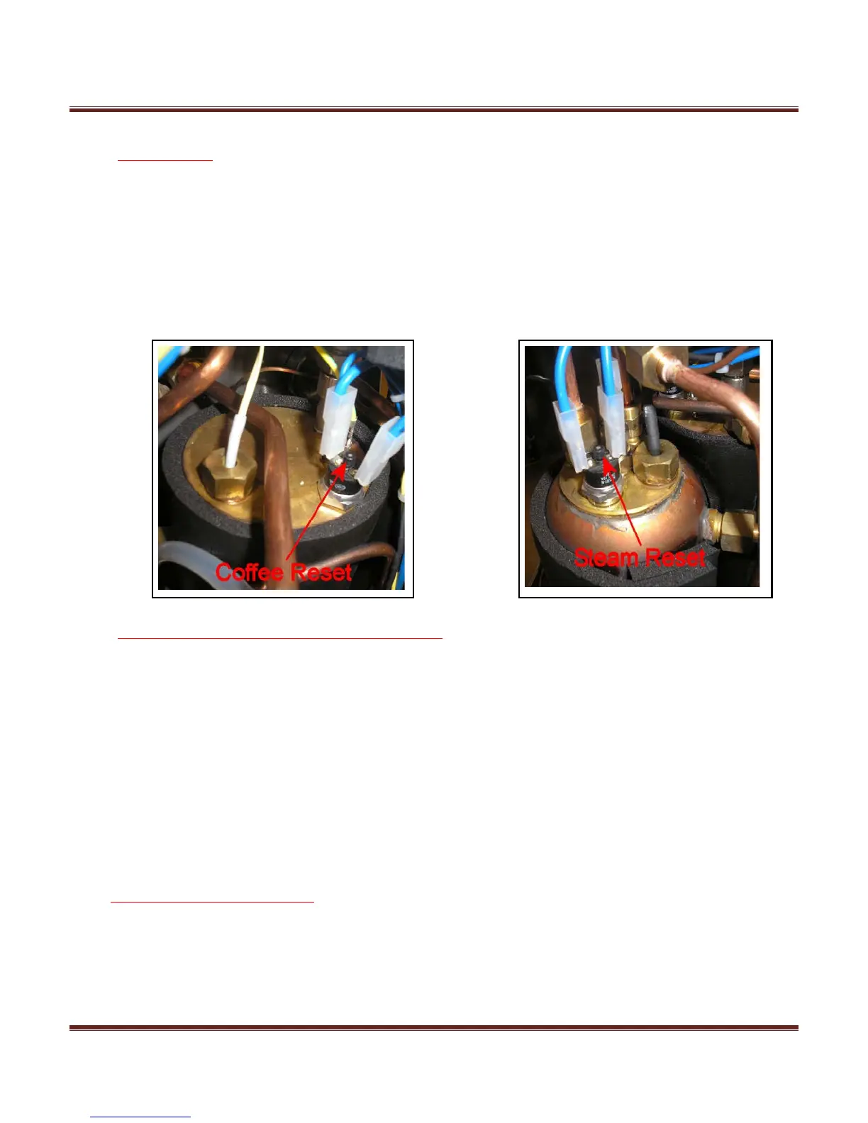 • Check the resettable hi-limit switch on each boiler. To do so unplug the machine and