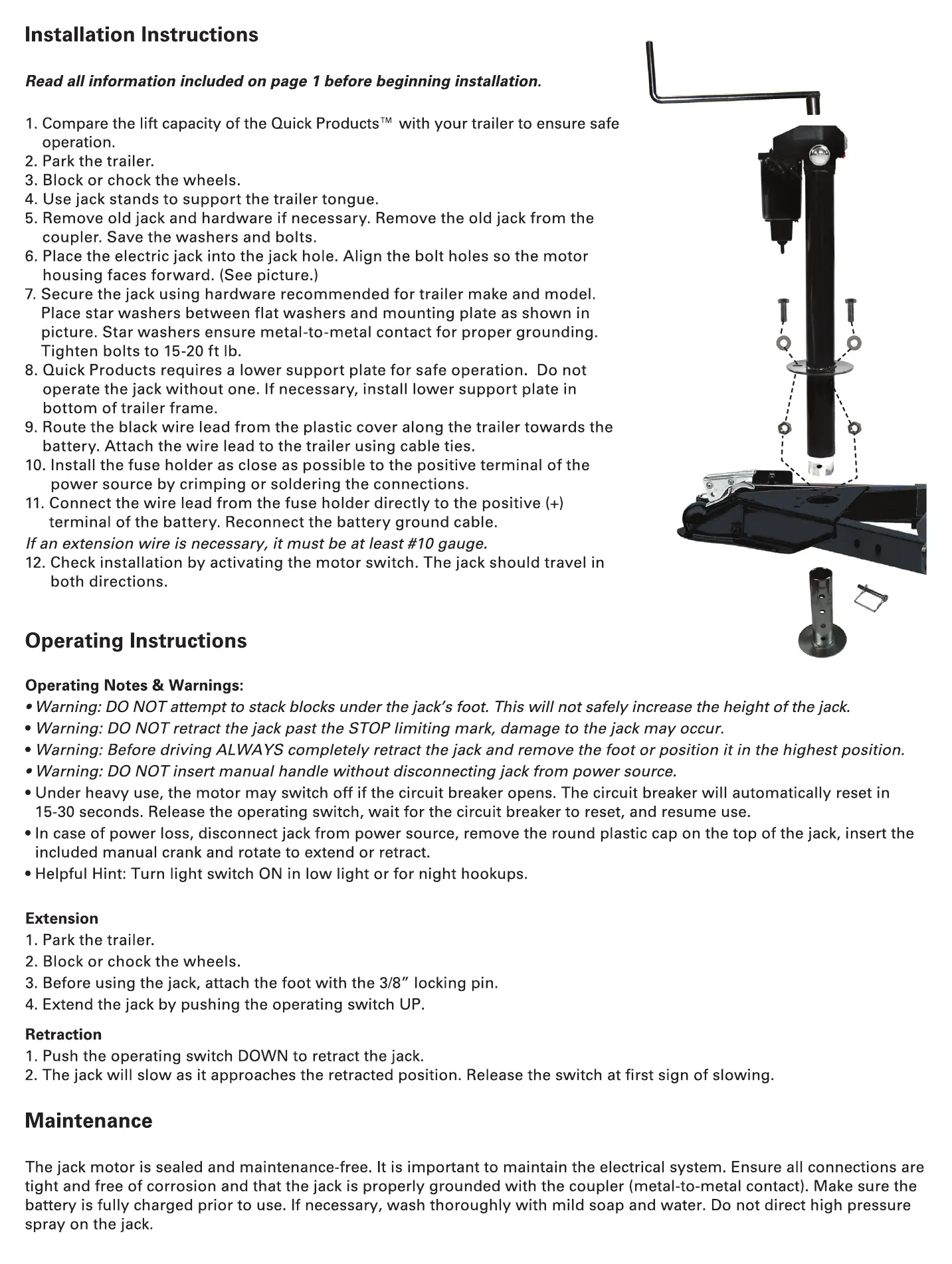 The jack motor is sealed and maintenance-free. It is important to maintain the electrical system. Ensure all connections are