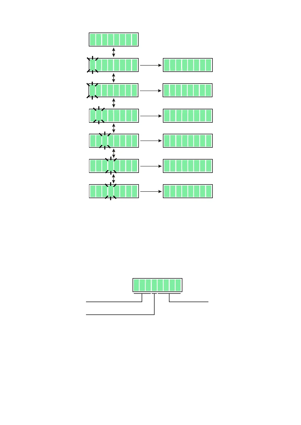 - Use keys M+ or M- to cause blinking to stop; sewing is possible again.