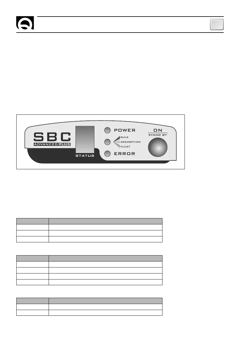 LED POWER, LED FASE DI CARICA (BULK, ABSORPTION, FLOAT), LED ERROR, cifra STATUS