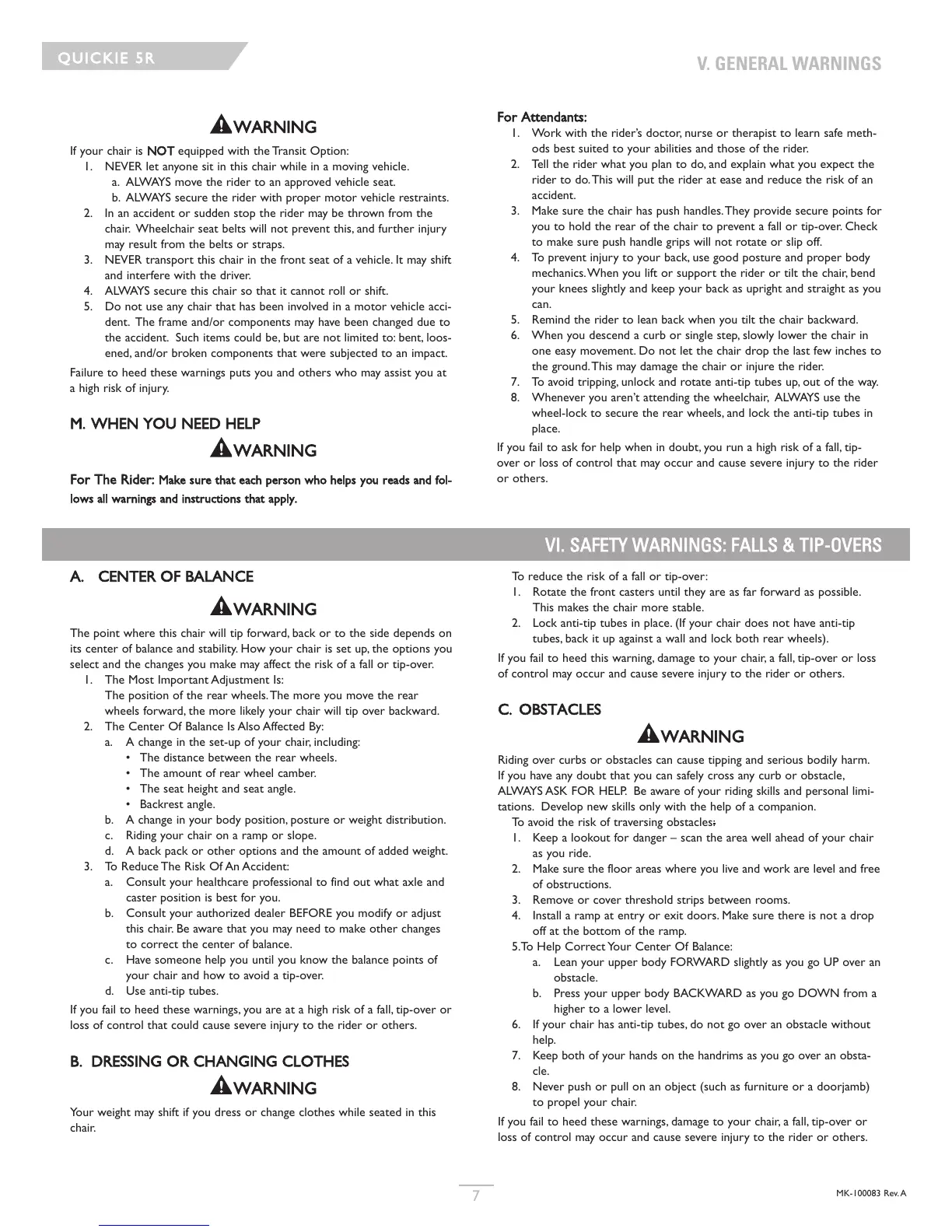 VI. SAFETY WARNINGS: FALLS & TIP-OVERS