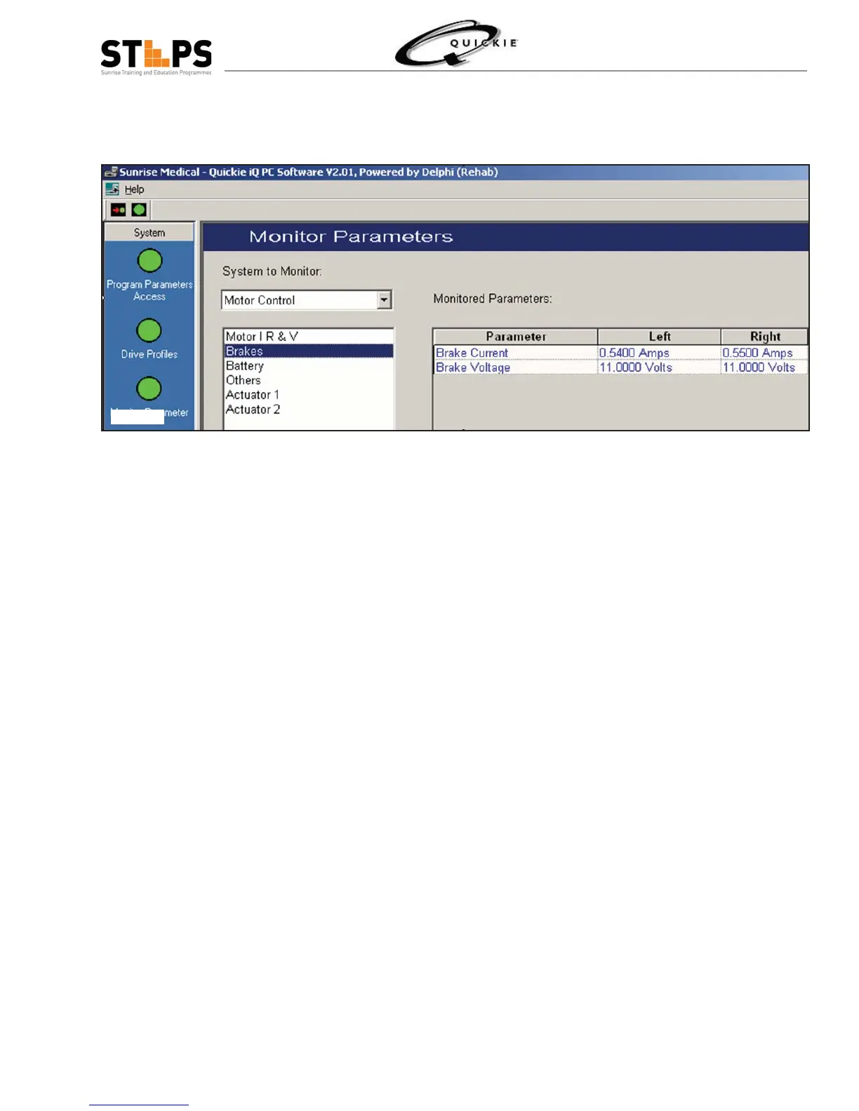 Operate the wheelchair by moving the joystick slight forward. Observe the Brake Current and Brake Voltage. 11.