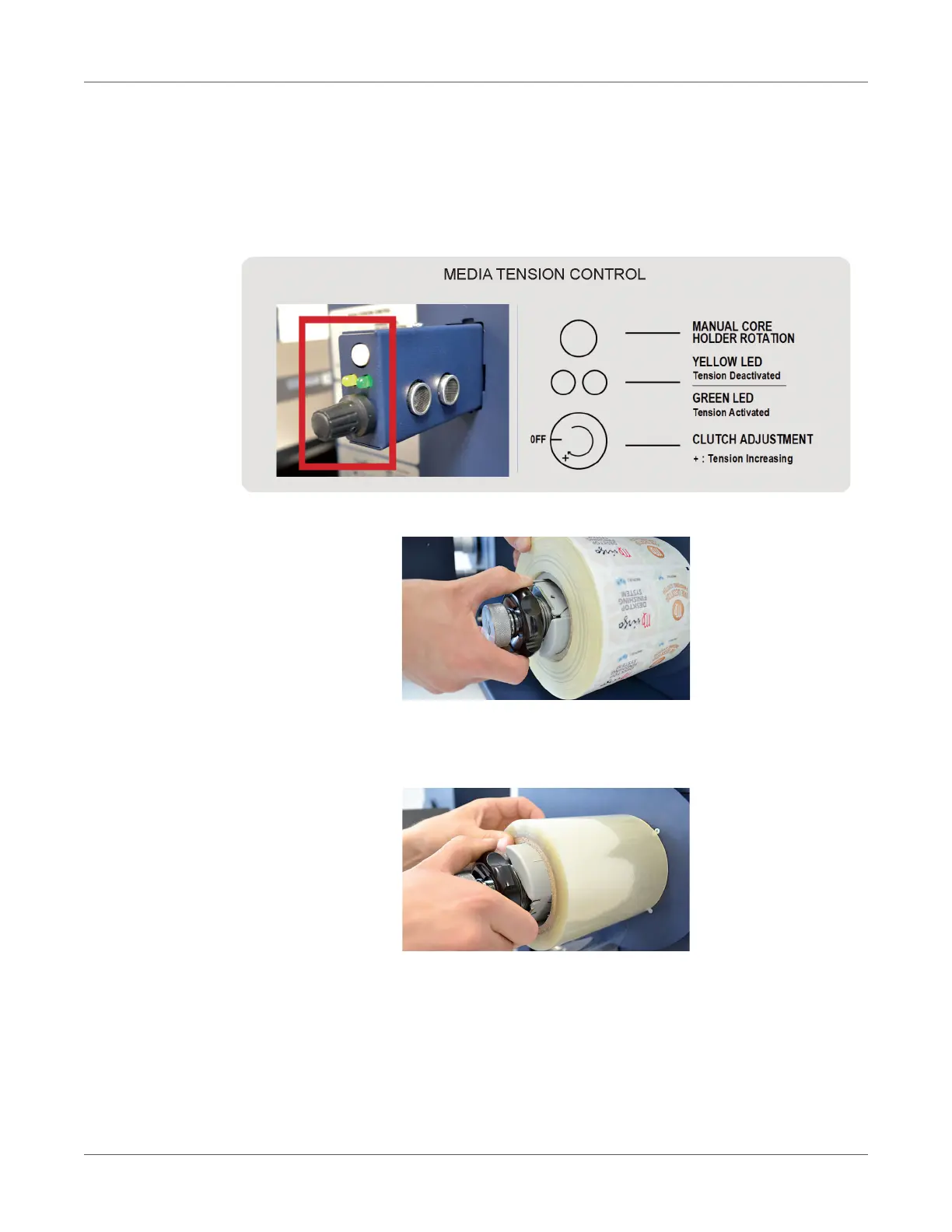 1. Load the printed roll against the disk. Tighten the core holder.