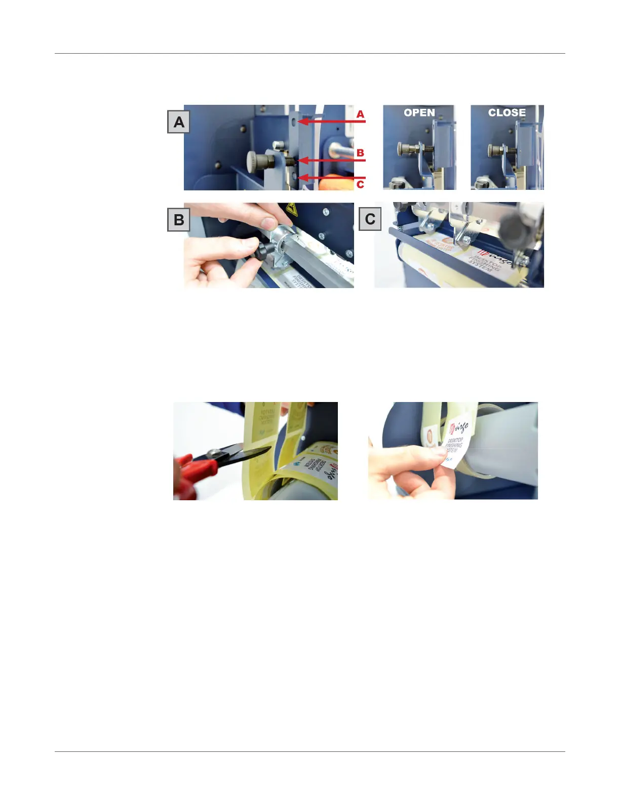 2. Pull the media through the aluminum rollers and attach the labels to the core using a