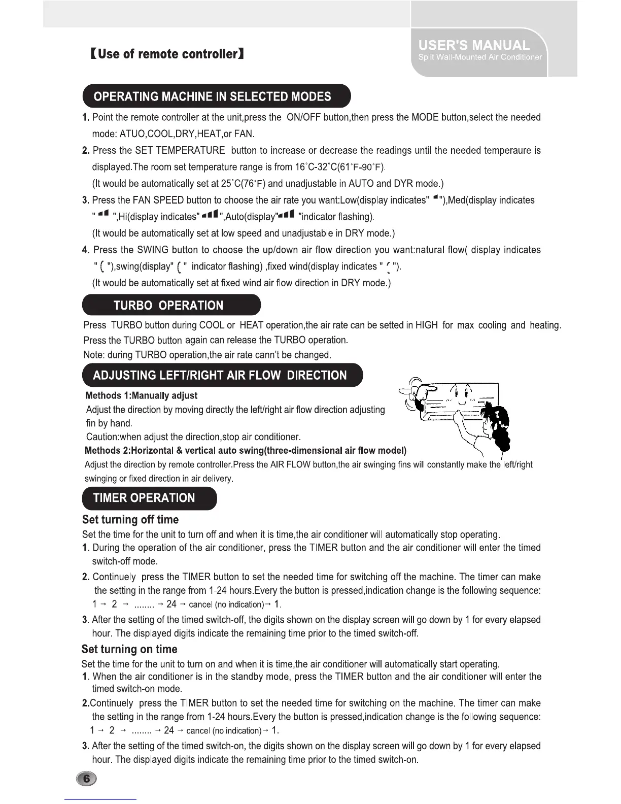 Quietside QSCE-093 - Using the Remote Controller; Selecting Operating Modes; Turbo, Airflow Adjustment, and Timer Operations