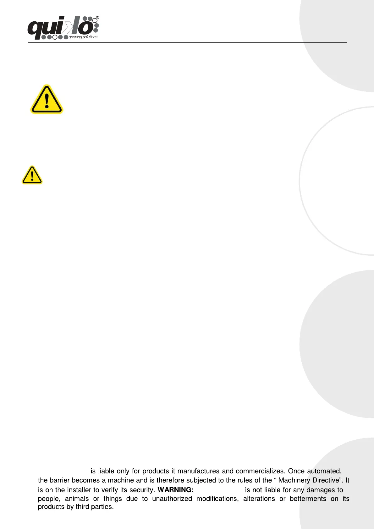 WARNING: Do not use spare parts or accessories not indicated by Quiko Italy Srl. Their use and/or