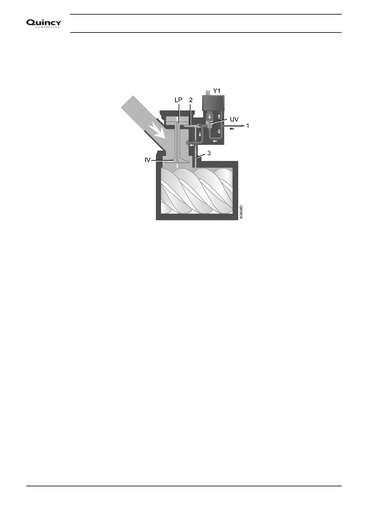 • Unloading valve/blow-off valve (UV) moves downwards, closing off the connection to