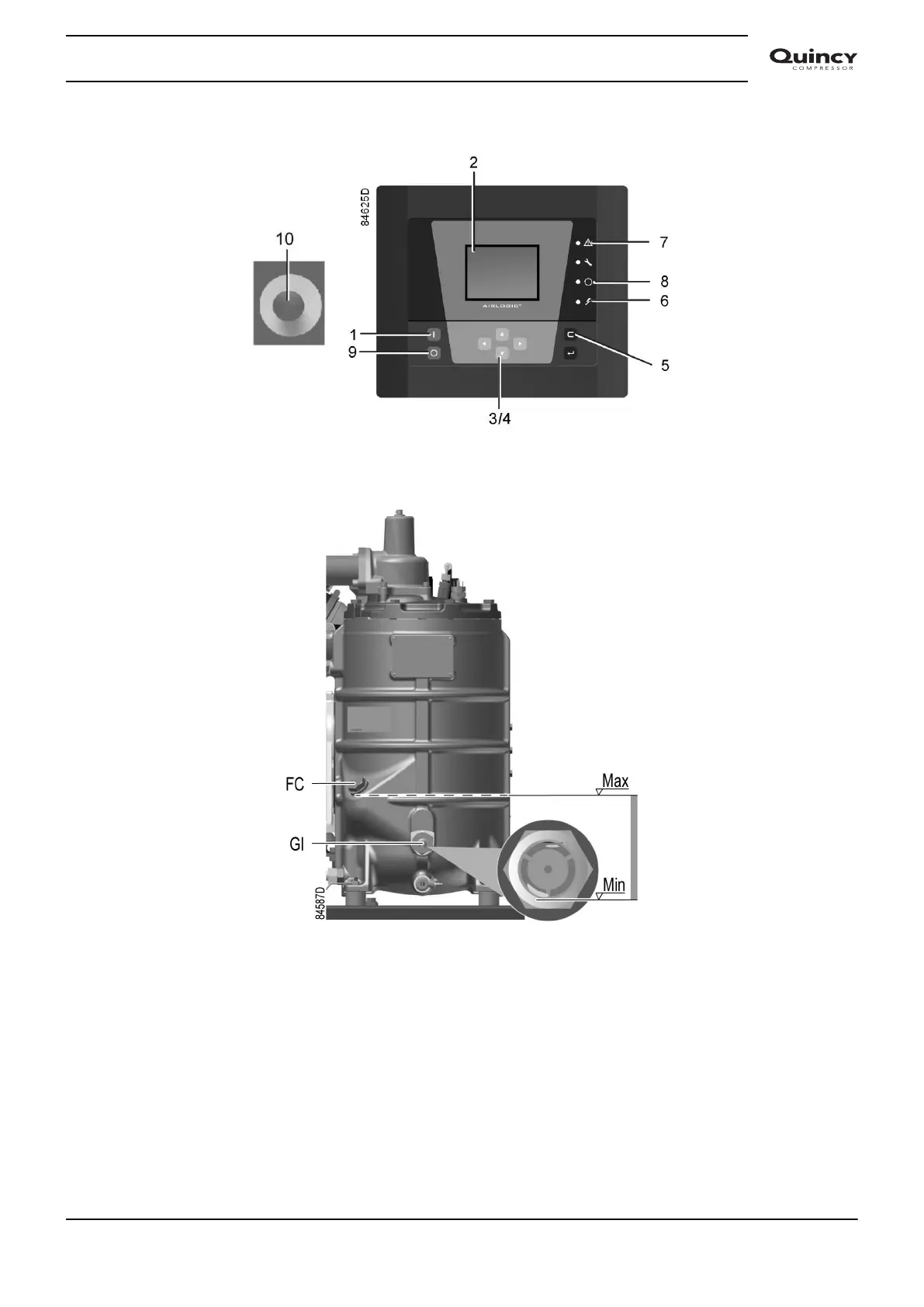 3. If the oil level is too low, push the emergency stop button (10) to avoid the compressor to