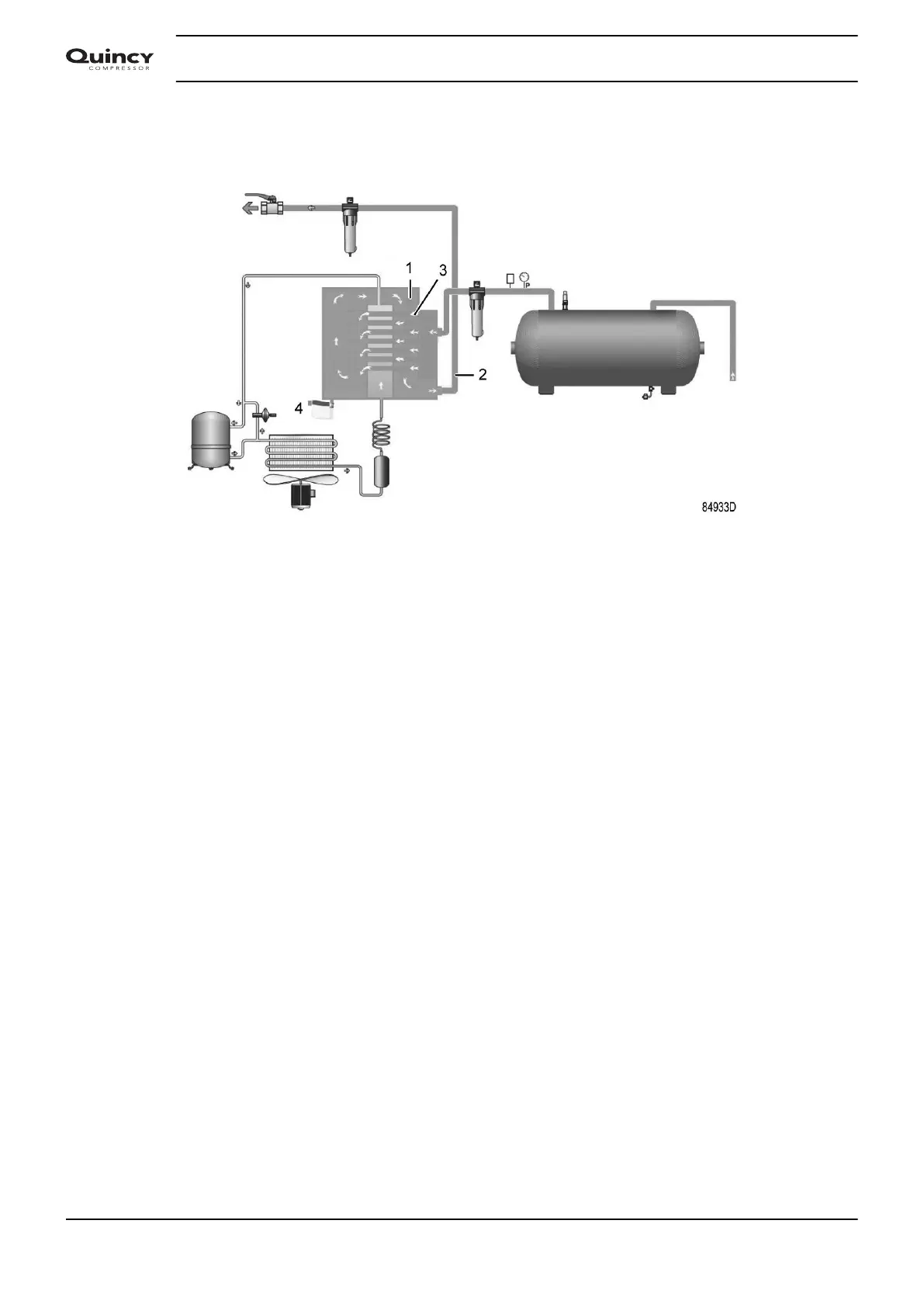 Wet compressed air enters the dryer and is further cooled by the outgoing, dried air (2). Moisture