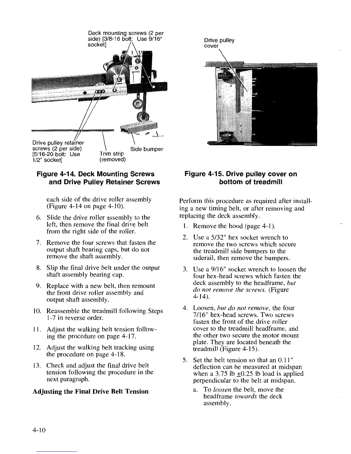 Quinton Q50 - Adjusting the Final Drive Belt Tension; Deck Mounting Screws and Drive Pulley Retainer Screws; Drive Pulley Cover on Bottom of Treadmill