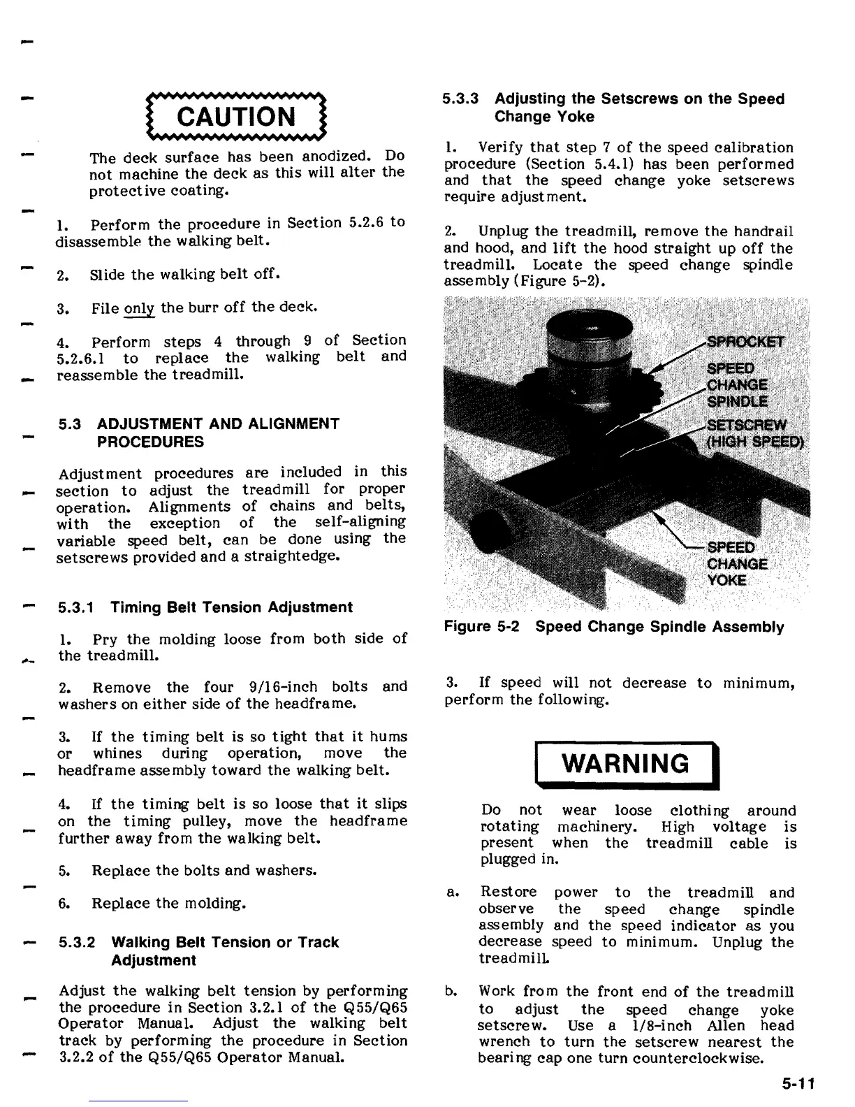 Quinton Q55 - Adjustment and Alignment Procedures; Timing Belt Tension Adjustment; Walking Belt Tension or Track Adjustment; Adjusting the Setscrews on the Speed Change Yoke