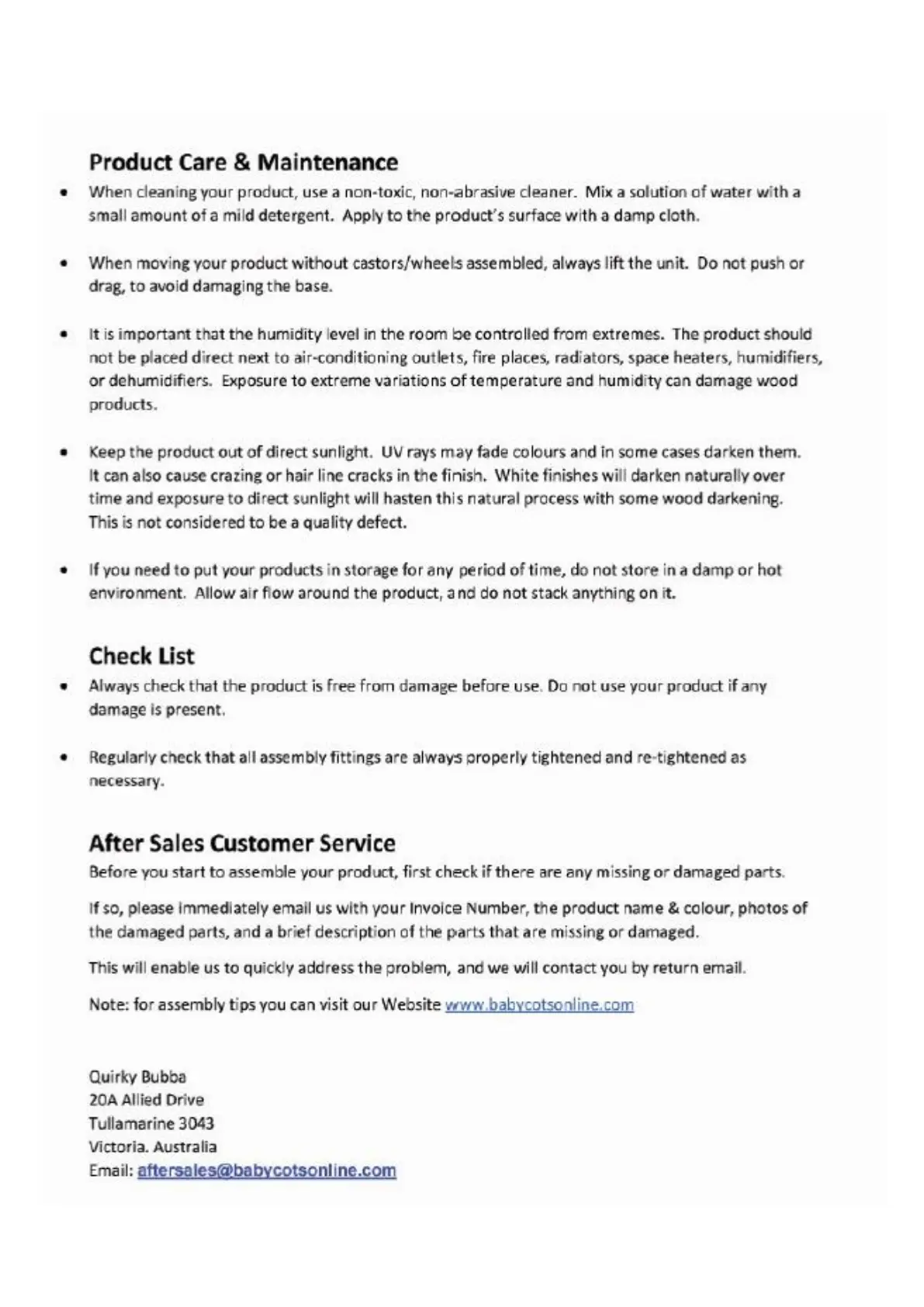 Quirky Bubba Sienna Cot - Product Care and Maintenance Guide; Cleaning and Handling Instructions; Environmental Considerations; Pre-Use and Regular Checks