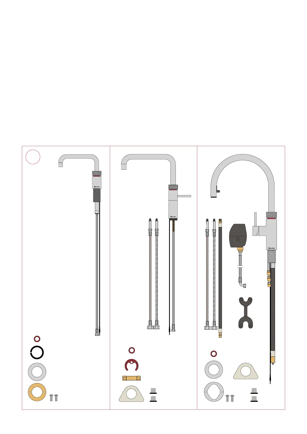 boiling water hose, white tap support, two inlet hose screens and quick-release tool.