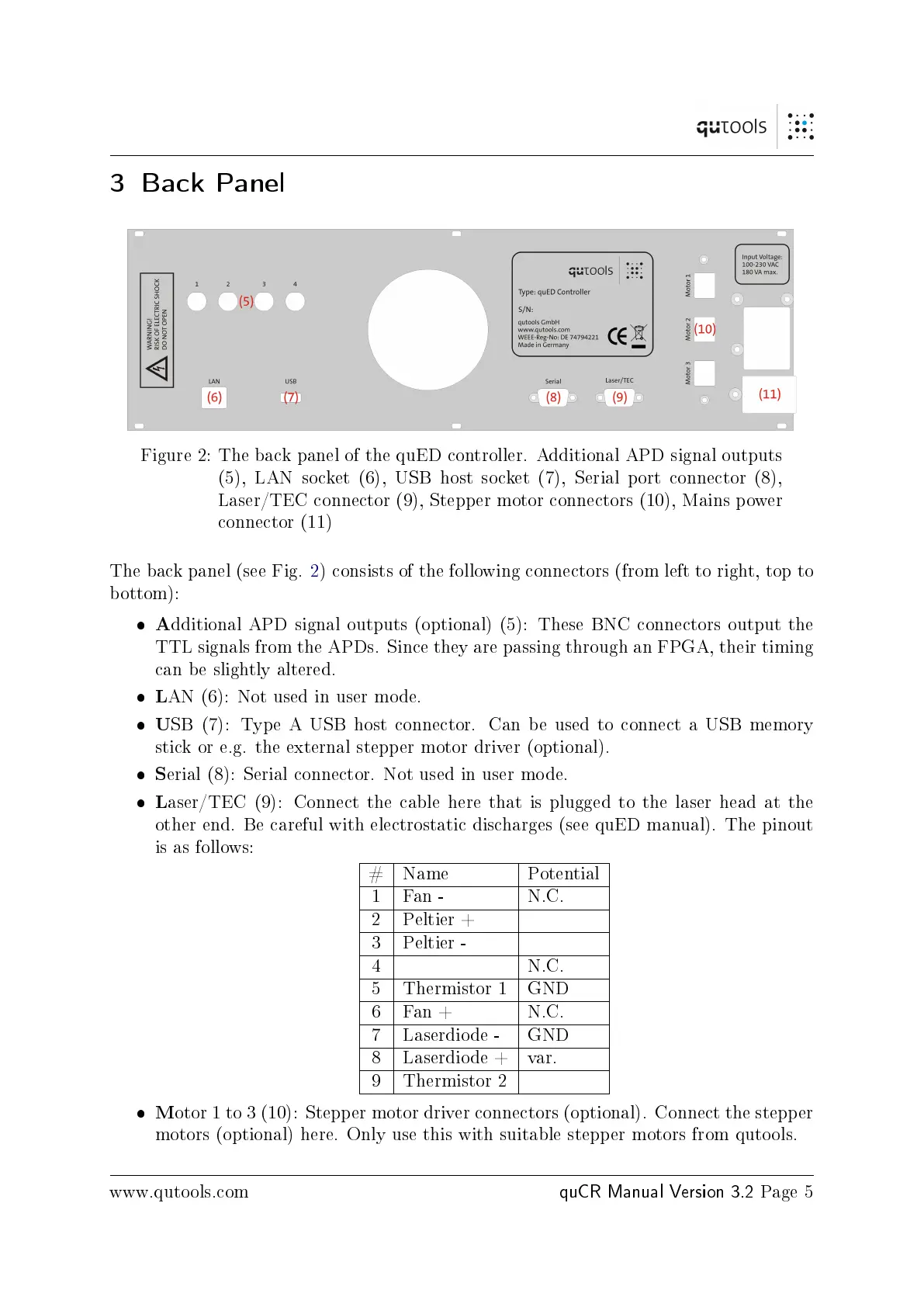 Laser/TEC connector (9), Stepper motor connectors (10), Mains power
