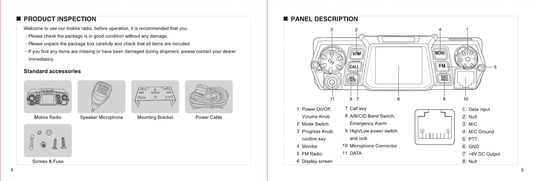 QYT KT-780 PLUS - Product Inspection and Panel Description; Initial Product Inspection; Front Panel Overview; Accessory Connector Pinout