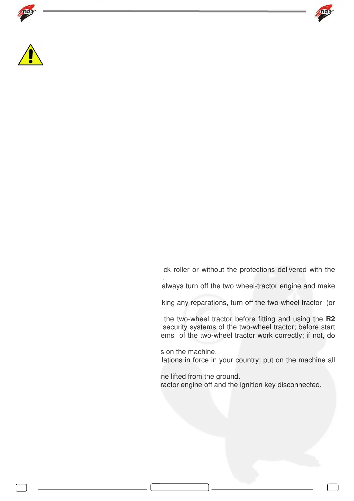 16. Always read the instruction booklet of the two-wheel tractor before fitting and using the R2