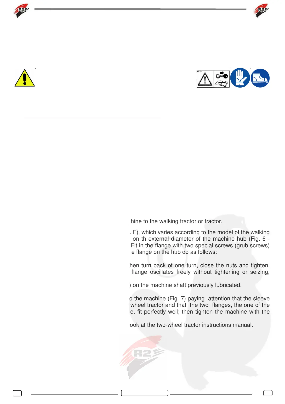 For the flange fixing to the two-wheel tractor, look at the two-wheel tractor instructions manual.