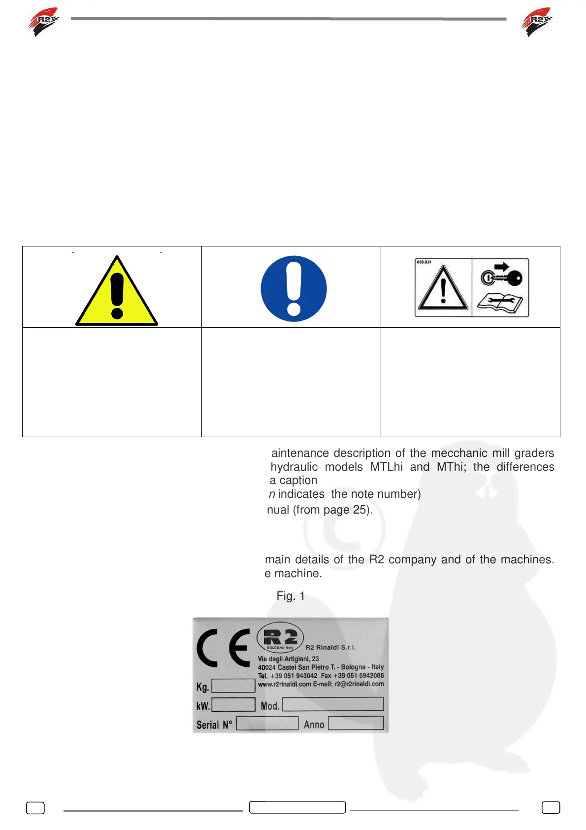 NOTE: This manual concerns the use and maintenance description of the mecchanic mill graders