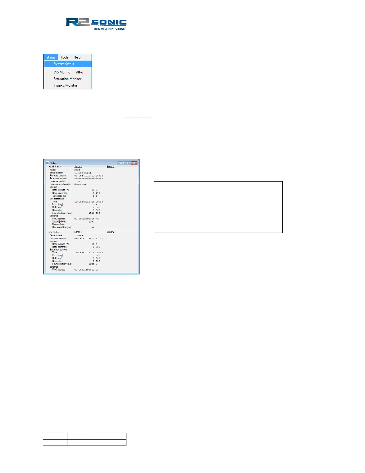The Status report provides a detailed list of the current system parameters in both the sonar head
