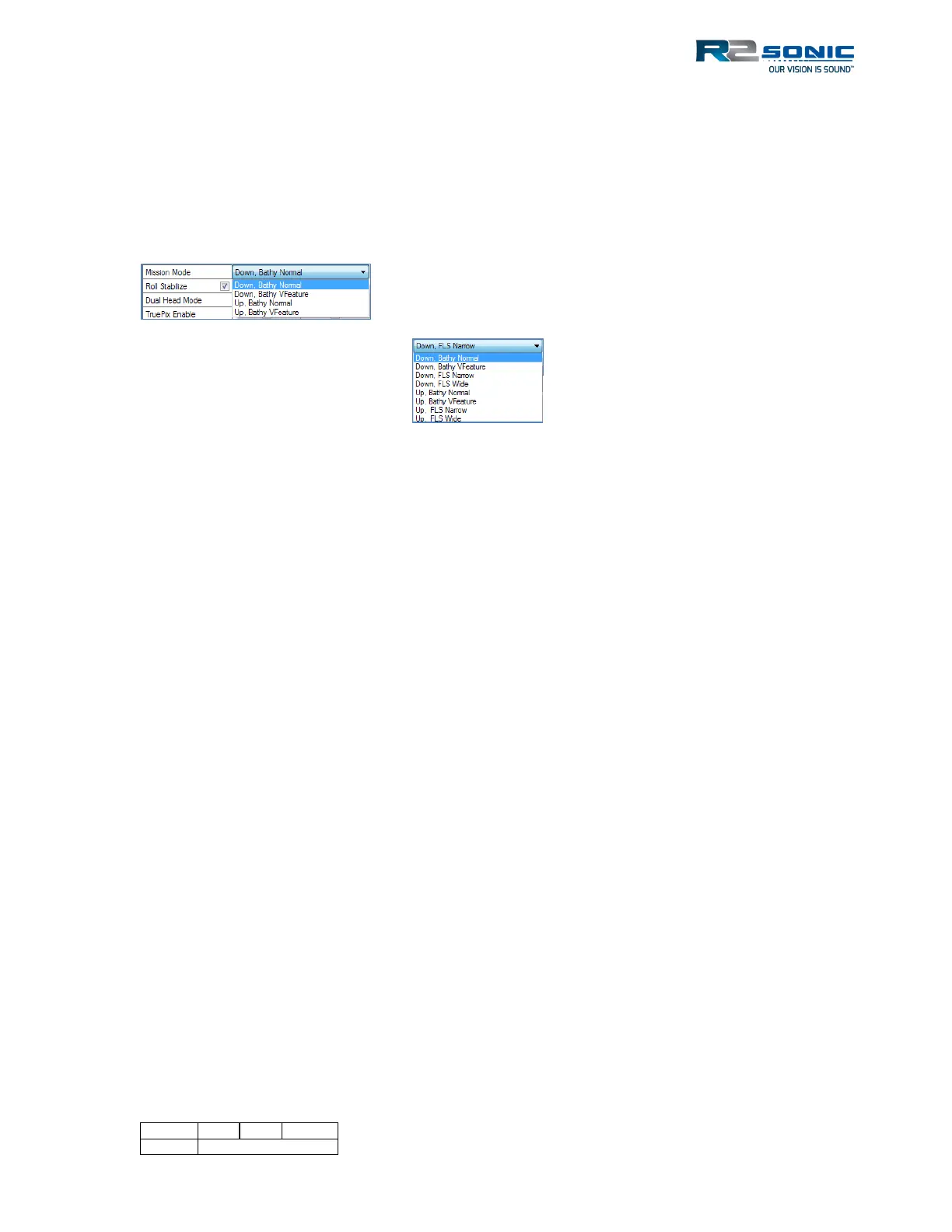 • Down, FLS Narrow/Wide (Type 1004 Projector): One Forward Looking Sonar mode. No