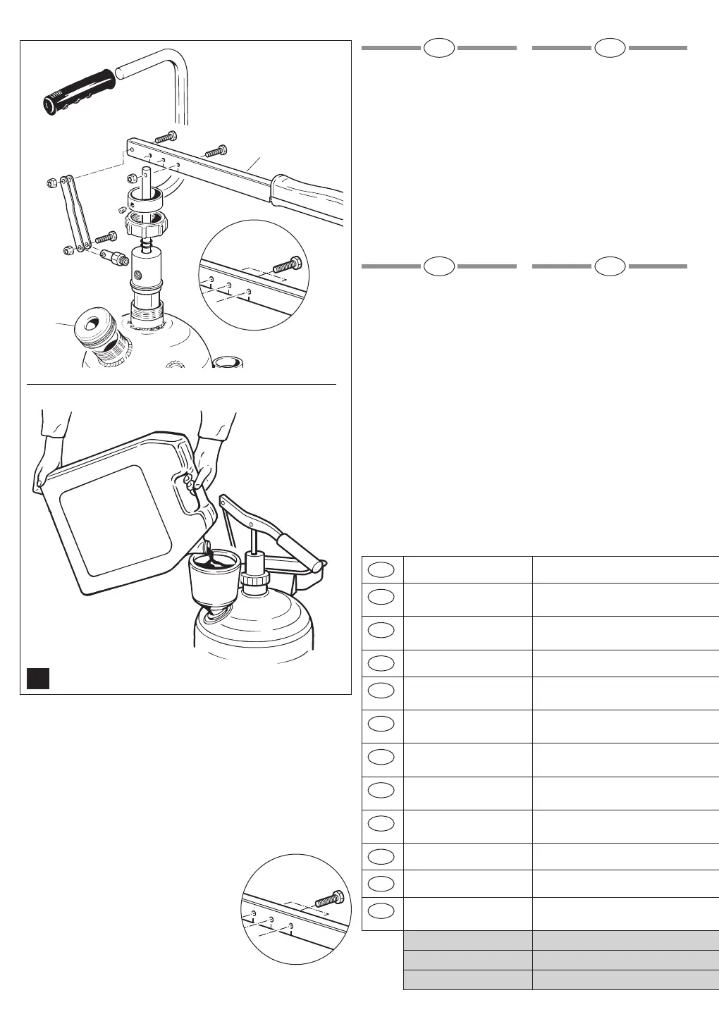 Position d'accrochage Course du tube plongeur Taux de compression obtenu Quantité distribuée par cycle complet du levier Indication des types d'huiles pouvant être distri-