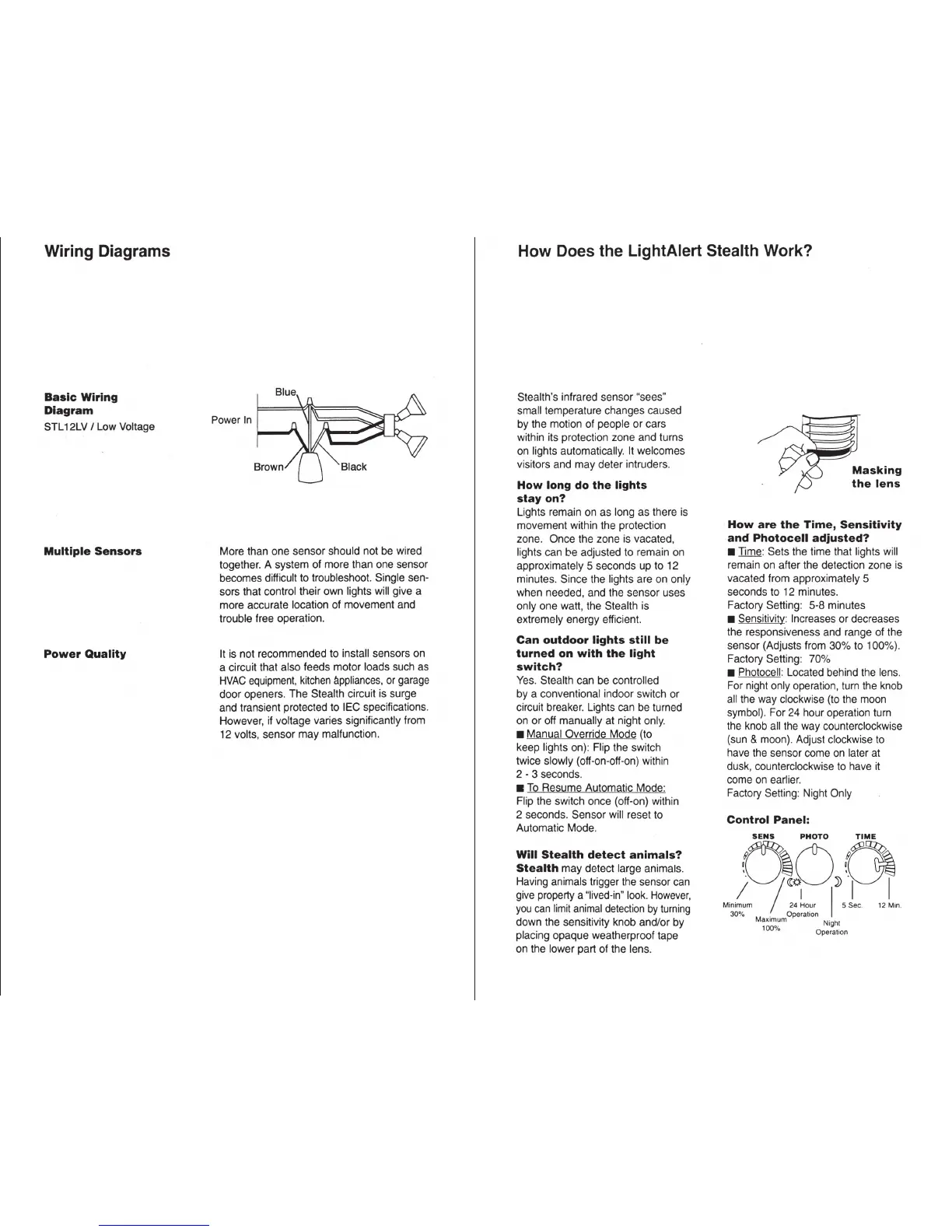 RAB Lighting STL12LV - How Does the LightAlert Stealth Work?; How long do the lights stay on?; Can outdoor lights still be turned on with the light switch?; Masking the lens