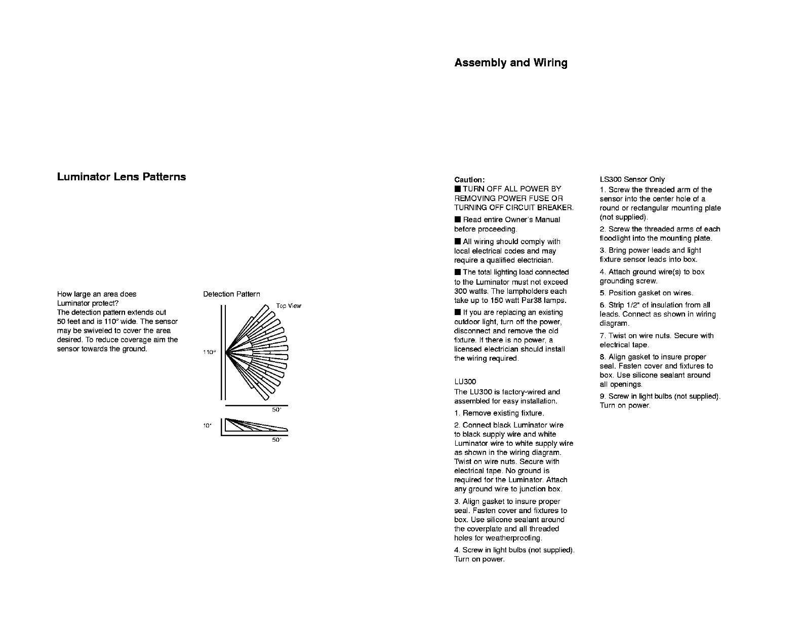 RAB LUMINATOR LightAlert! LU300 - Luminator Lens Patterns; How Large an Area Does Luminator Protect?; Assembly and Wiring