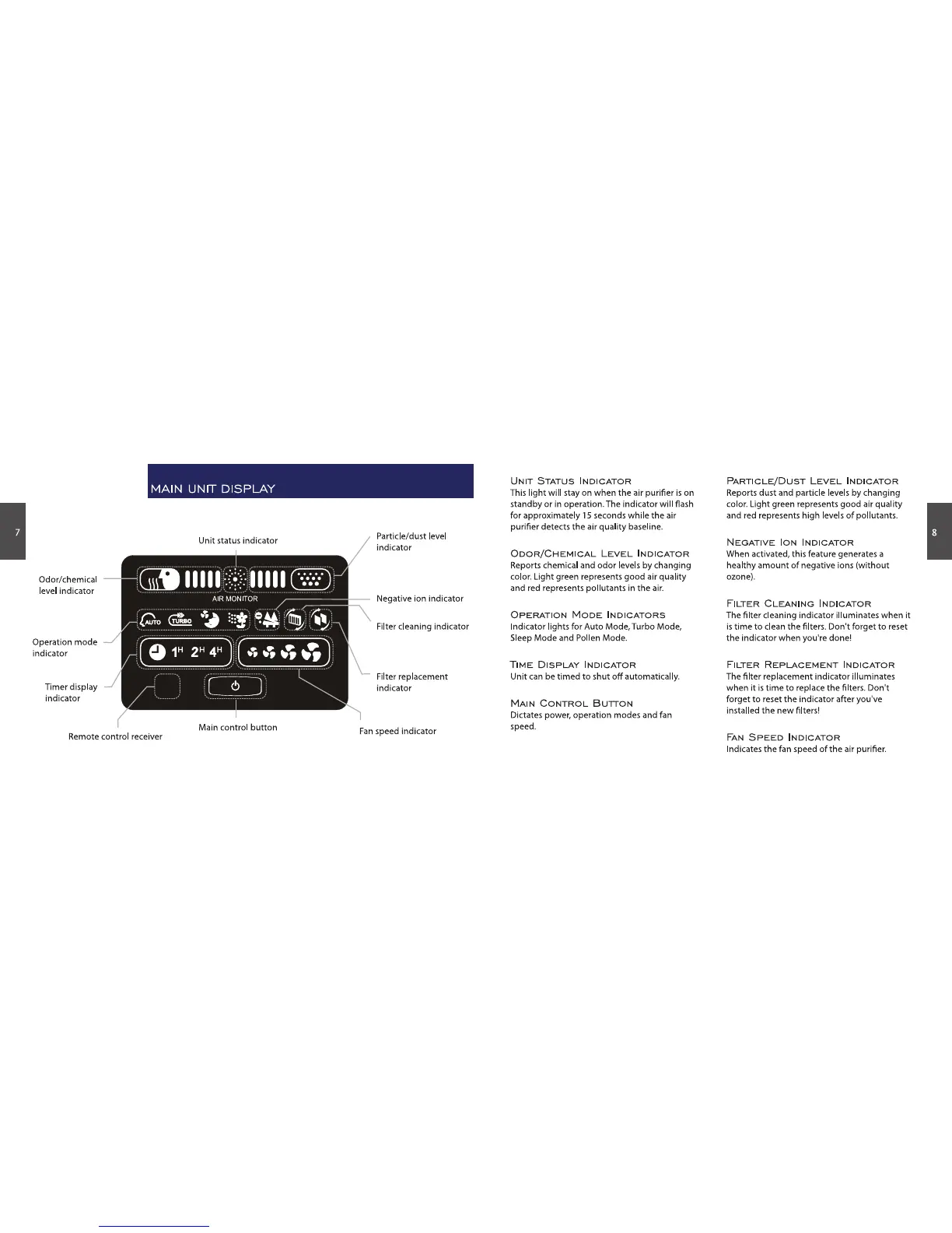 Rabbit Air BioGS SPA-421A - Main Unit Display; Indicator and Button Functions