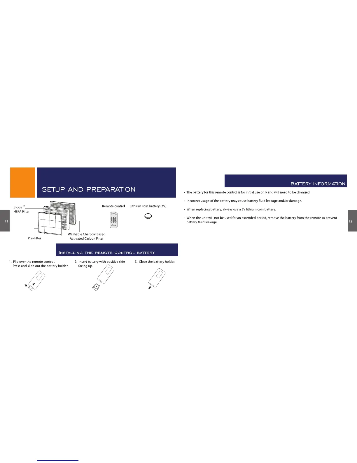 Rabbit Air BioGS SPA-421A - Setup and Preparation; Battery Information; Installing the Remote Control Battery