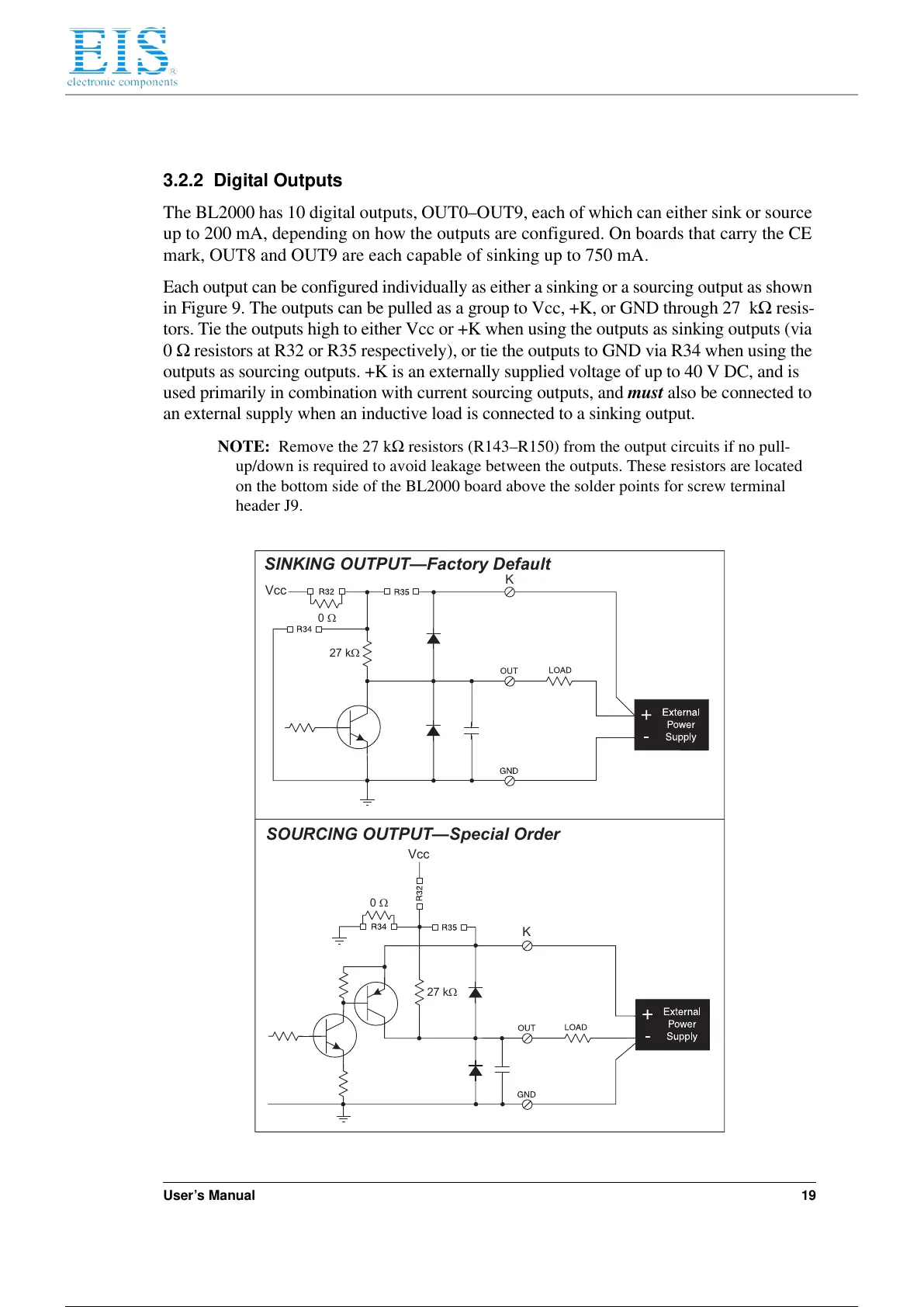 The BL2000 has 10 digital outputs, OUT0–OUT9, each of which can either sink or source