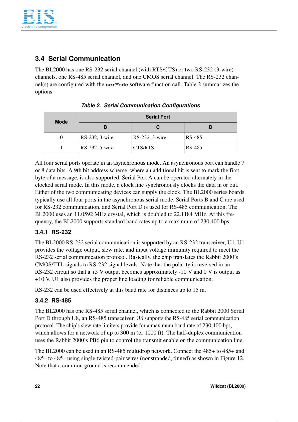 The BL2000 has one RS-485 serial channel, which is connected to the Rabbit 2000 Serial